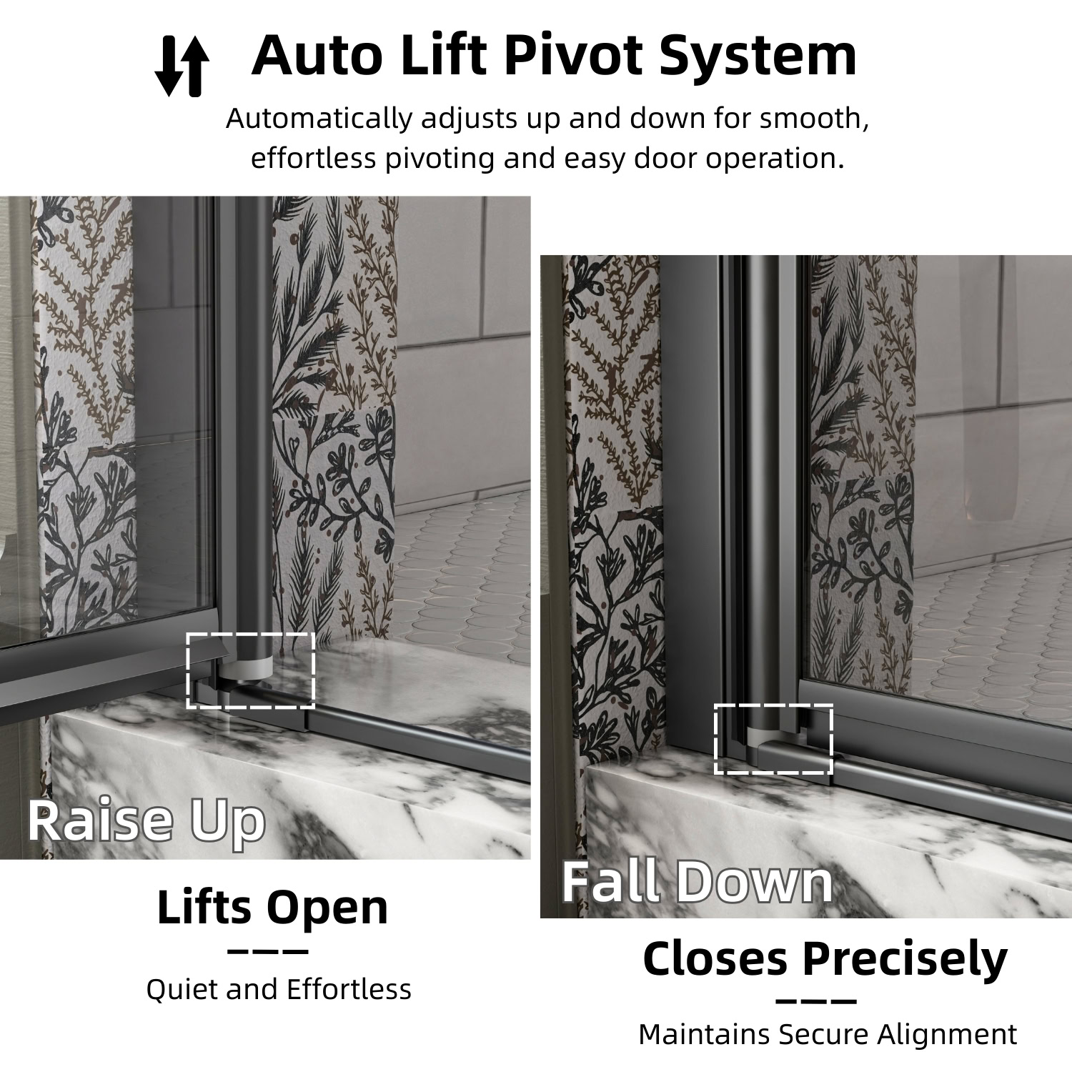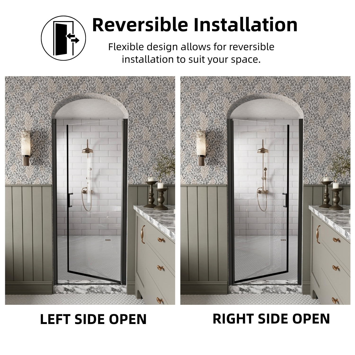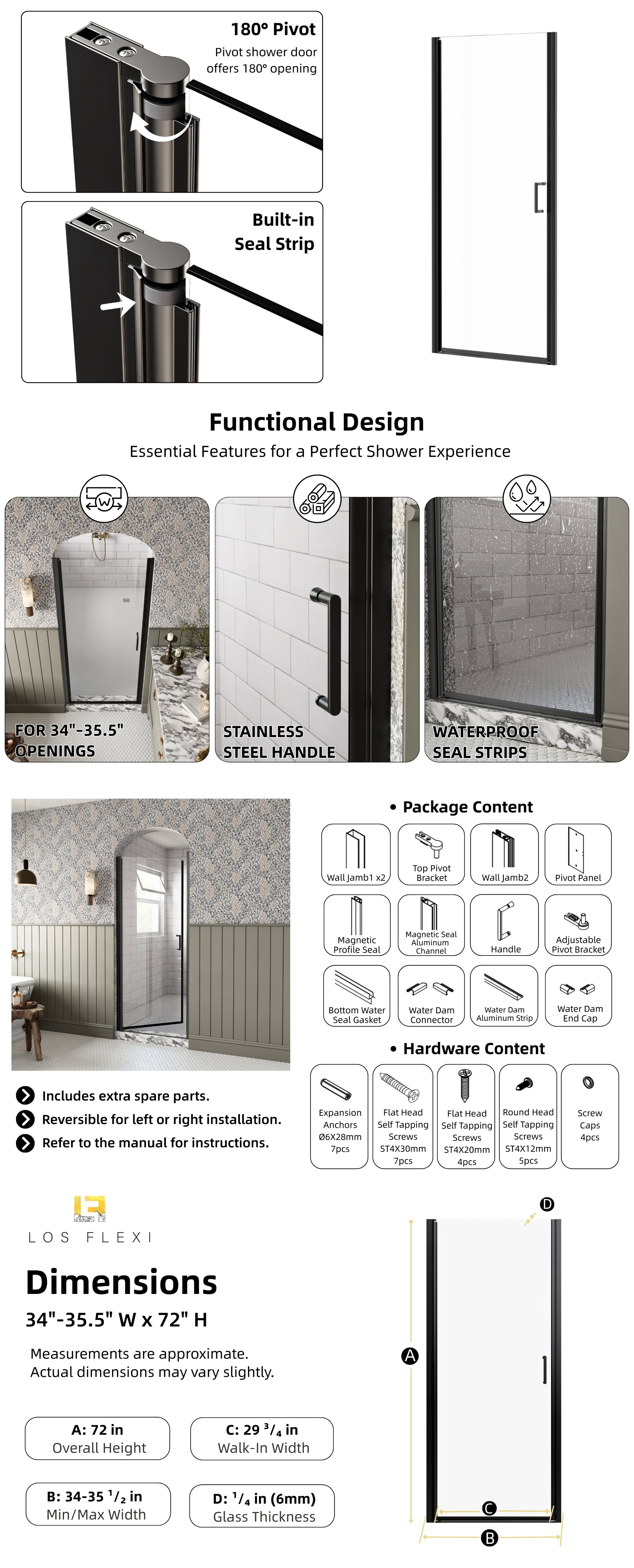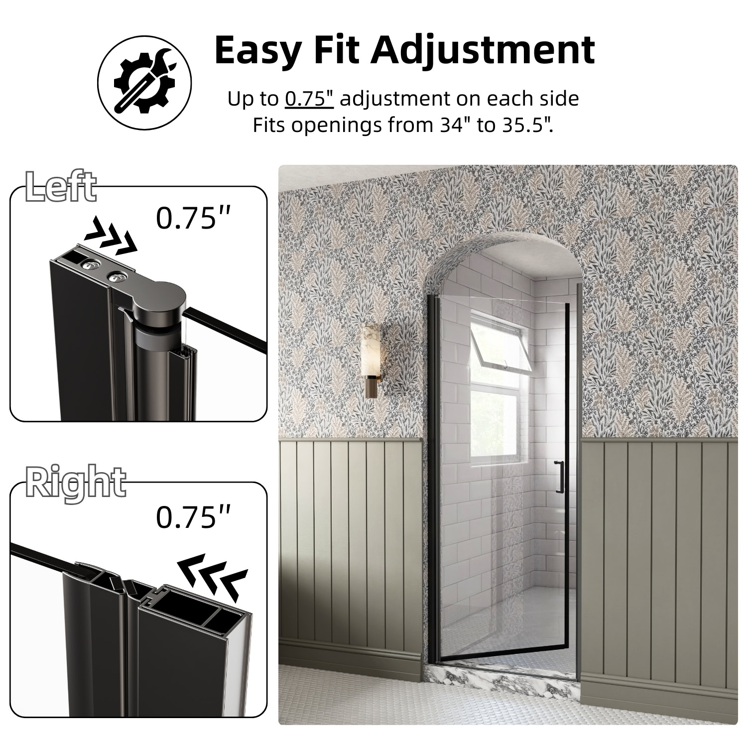 This pivot shower door is designed to fit tight spaces with an adjustable width of 34″ to 35.5″ and a height of 72″, making it perfect for standard shower openings. Made from 6mm SGCC-certified tempered glass, it offers strength and clarity, creating a durable, open feel in your shower. Featuring a magnetic seal and bottom water seal gasket, it effectively contains water, keeping your bathroom floor dry. The sleek matte black aluminum frame adds a modern touch, while the smooth up-and-down pivot system ensures effortless operation. With easy reversible installation and all required hardware included, setup is quick and hassle-free. Backed by a 1-year warranty, this shower door offers both durability and peace of mind.