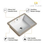 Los Flexi 16″x12″ white ceramic undermount bathroom sink with overflow. Sleek, durable, and easy to clean—perfect for small bathrooms and space-saving installations.