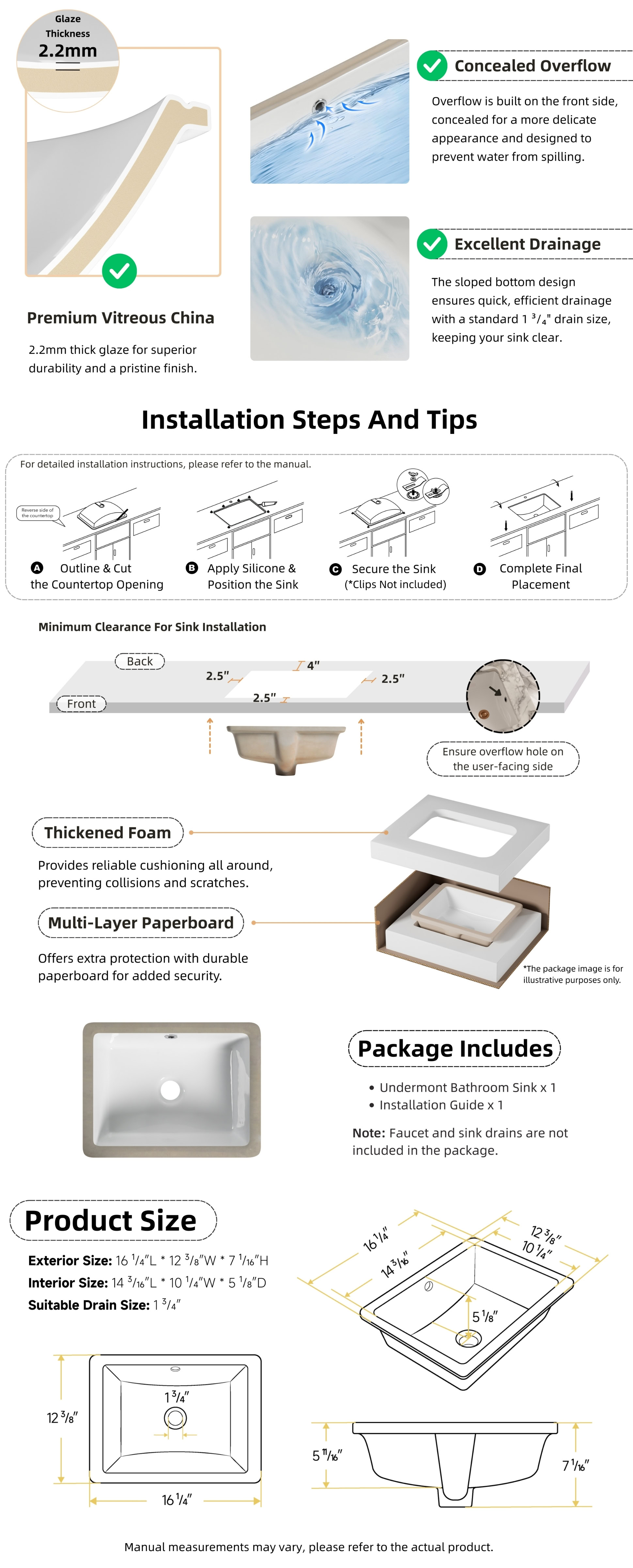Upgrade your bathroom with the 16″ x 12″ Los Flexi Rectangular Undermount Sink, thoughtfully designed for small to medium spaces. Crafted from high-quality vitreous china, this compact vanity sink features a sleek rectangular shape and a glossy white finish that blends effortlessly with both modern and traditional decor. The non-porous surface resists stains and scratches, making it easy to clean and ideal for long-term use. Measuring 16 ¹/₄″ x 12 ³/₈″, it offers ample washing space without taking up valuable countertop area. A chrome-finished overflow hole prevents water spills while maintaining the minimalist aesthetic. The undermount installation ensures a seamless look that maximizes surface space. Backed by a 2-year limited warranty and a 48-hour response support policy, the sink arrives securely packaged to ensure it reaches you in perfect condition. Perfect for powder rooms, guest baths, or minimalist upgrades, this sink offers elegance, efficiency, and everyday durability.
