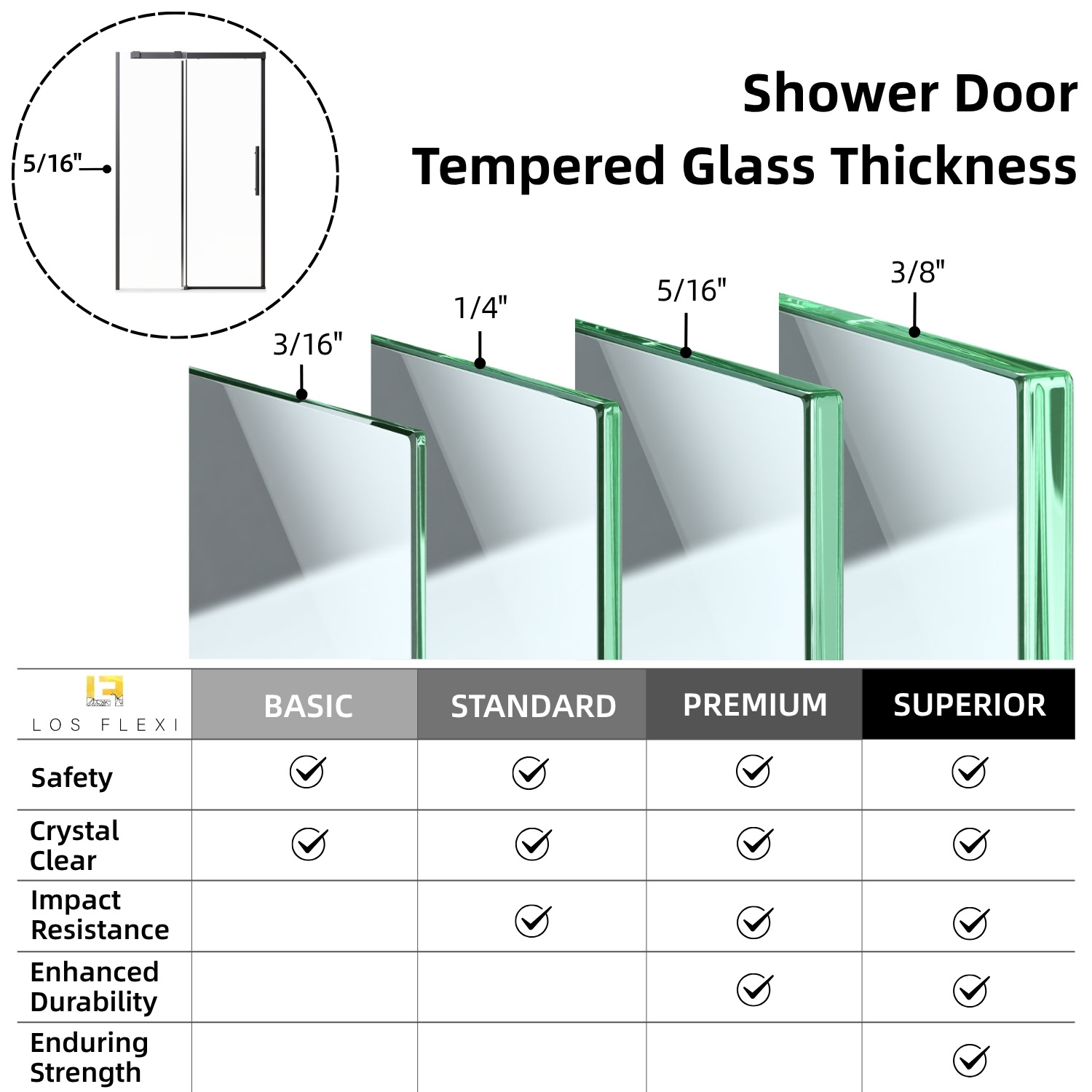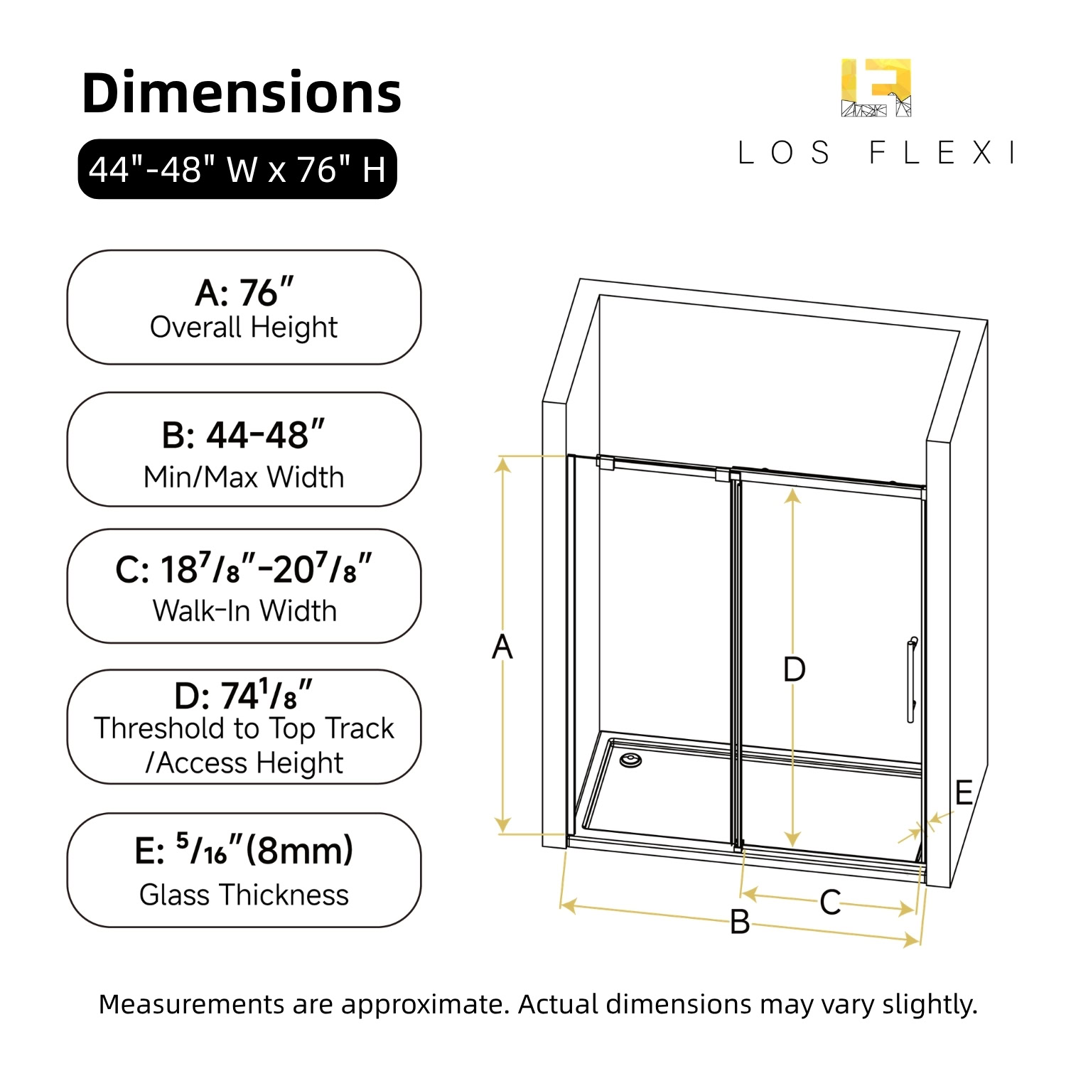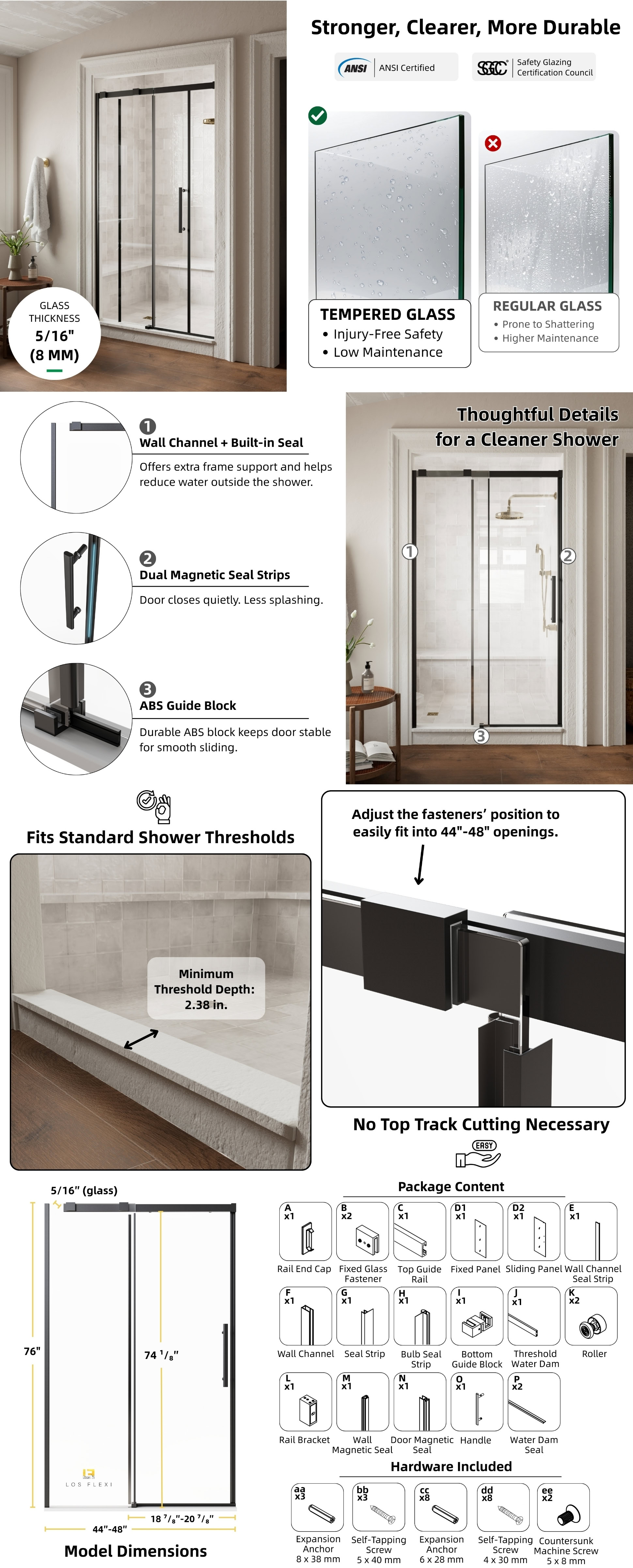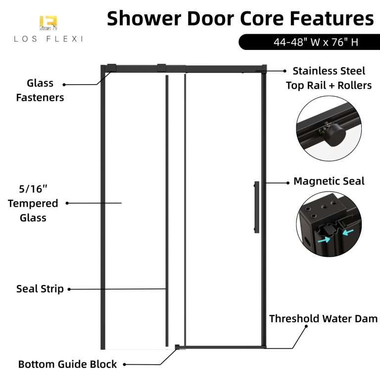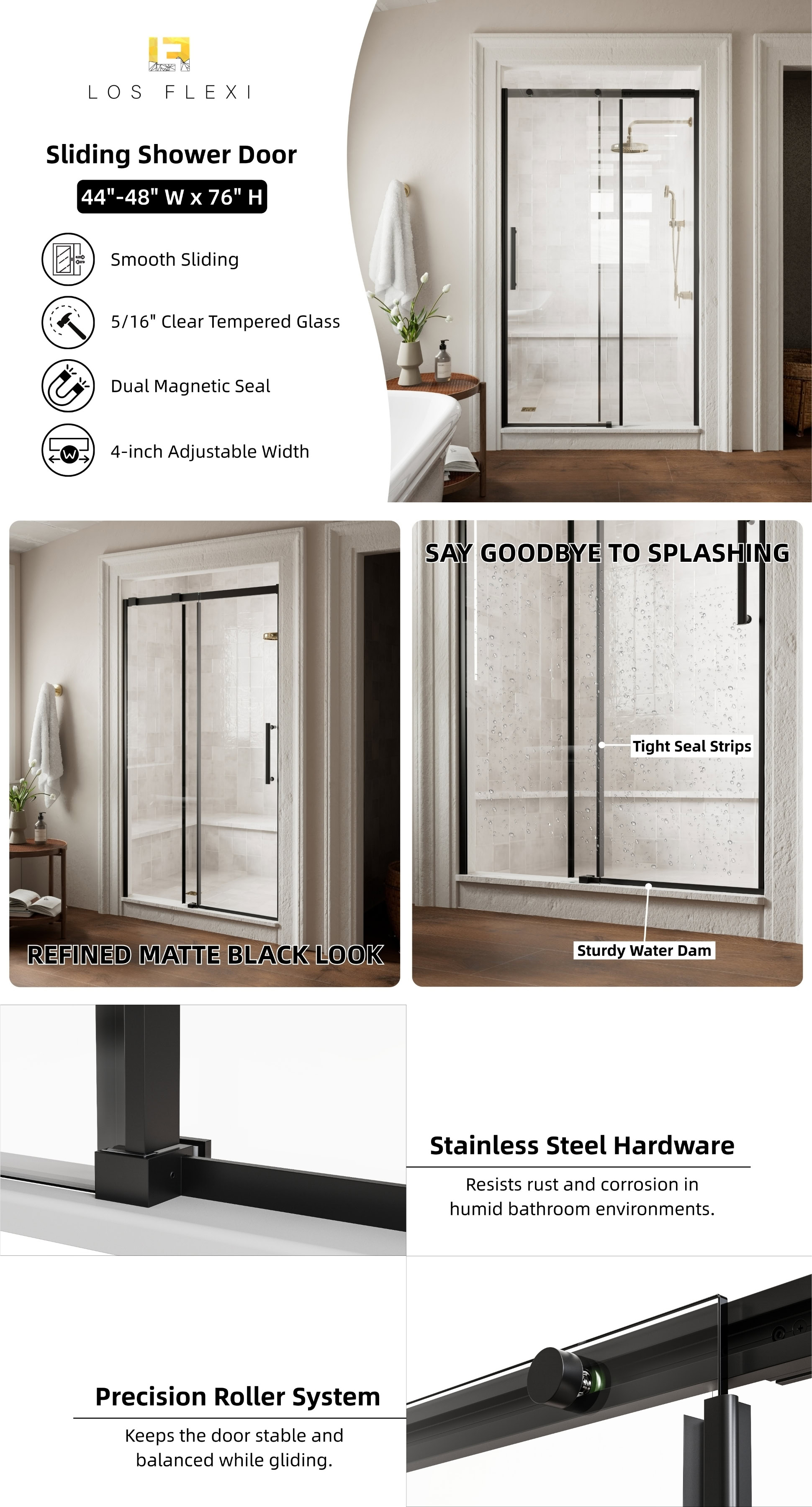 Los Flexi Single Sliding Shower Door Matte Black 48″W x 76″H with 5/16″ Tempered Glass