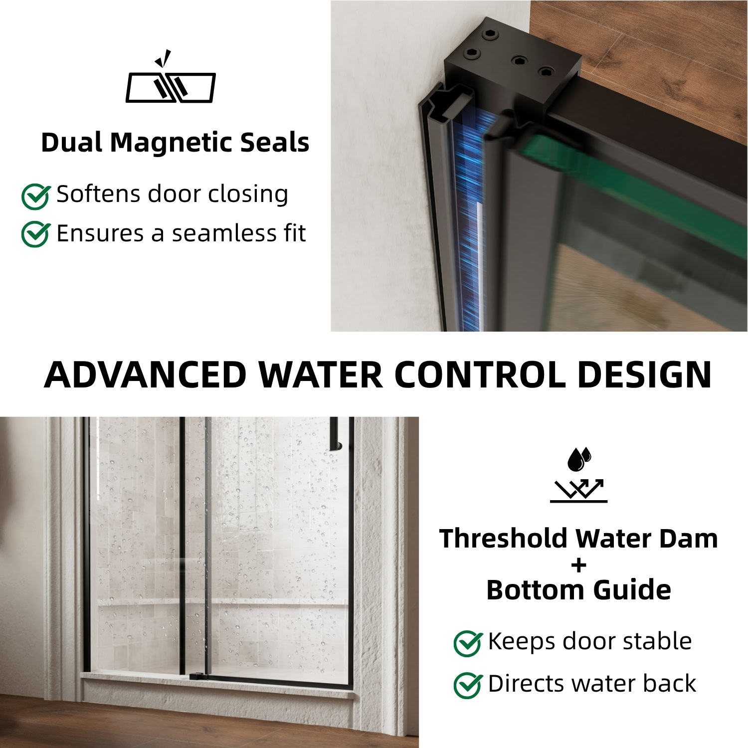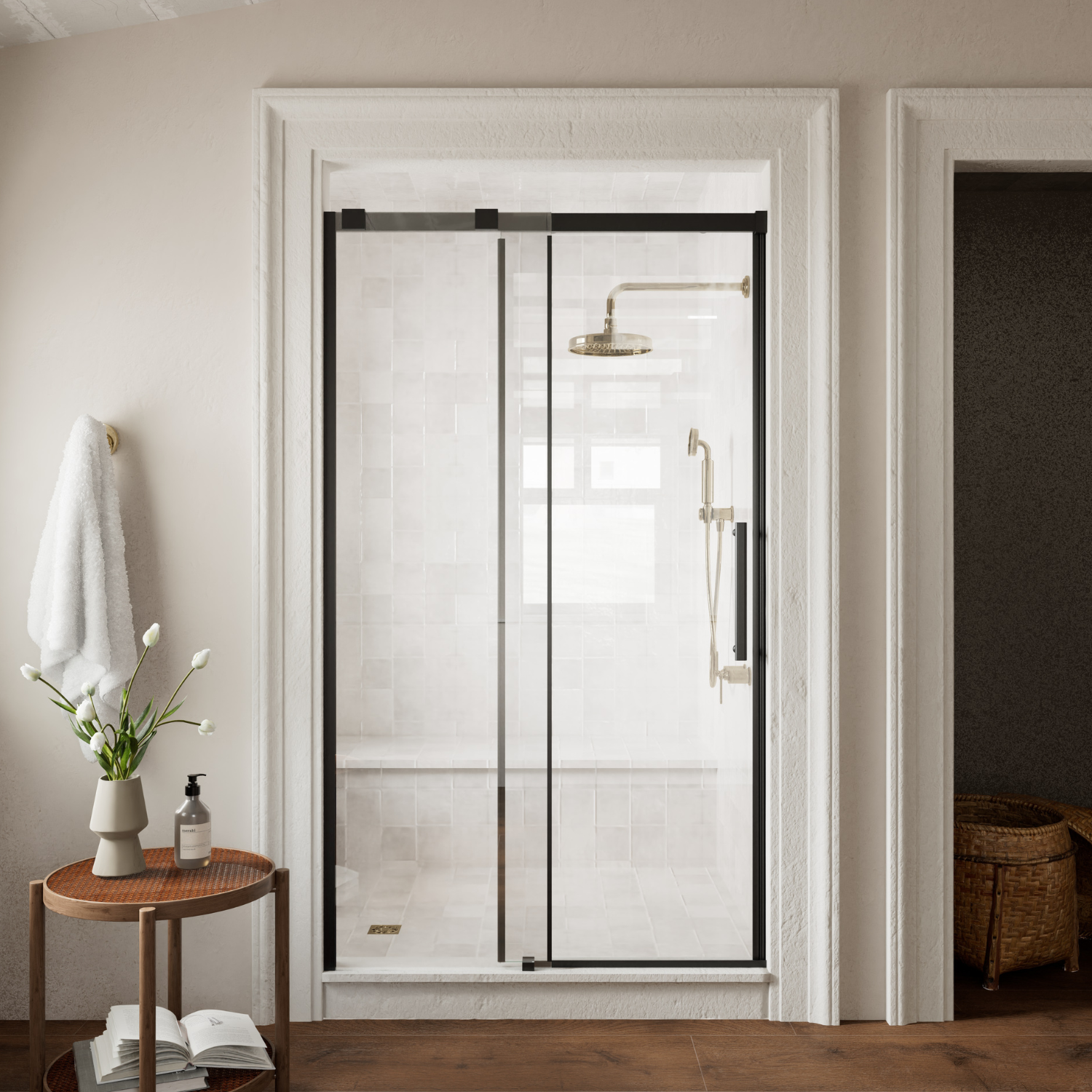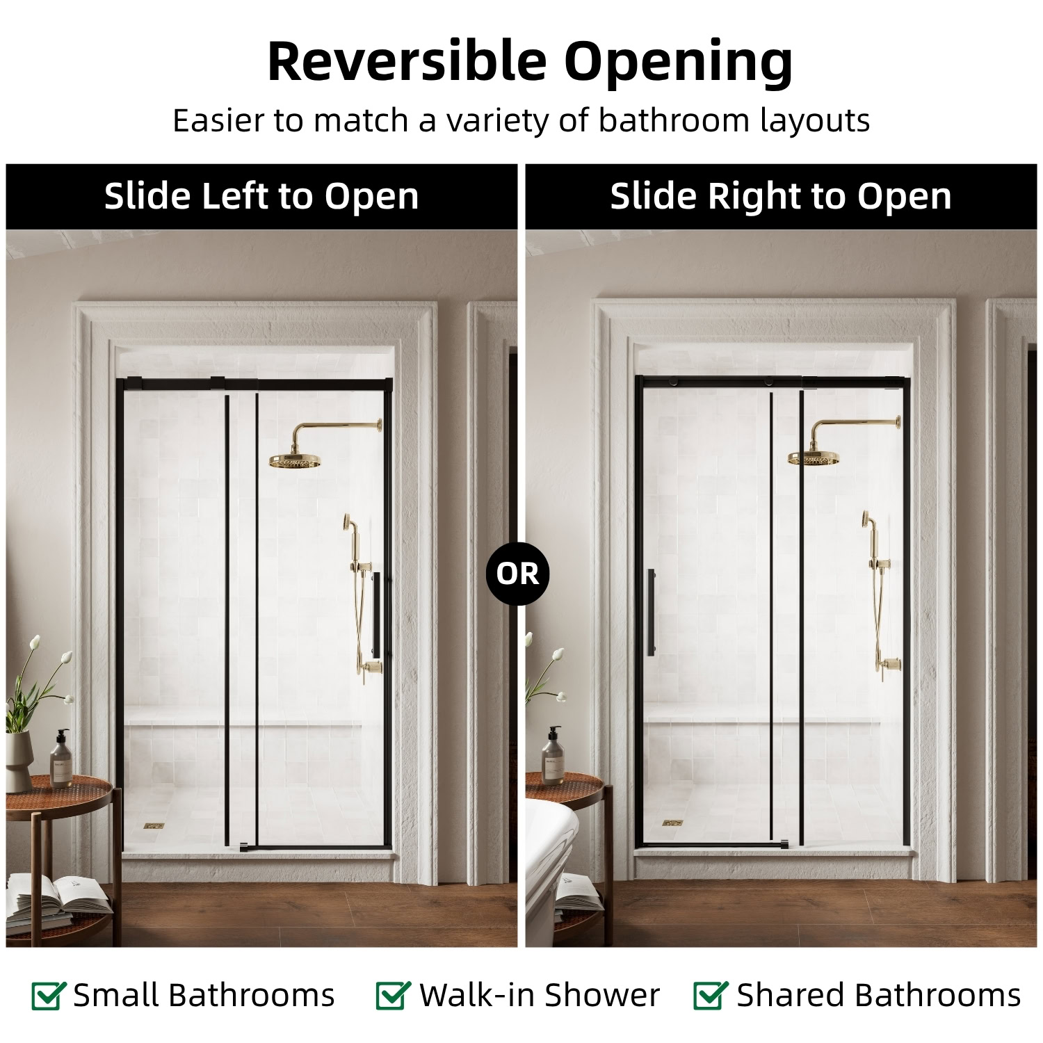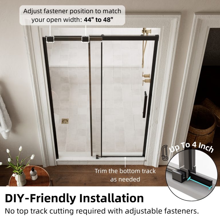 Upgrade your bathroom with this matte black sliding glass shower door, designed for a clean, modern look and smooth everyday use. Stainless steel rollers provide a quiet glide while creating a more open feel—ideal for both compact and modern spaces. Featuring a no-cut adjustable top track, this shower door fits 44″–48″ openings by repositioning the glass fasteners for a precise width adjustment—no top rail trimming required. The threshold can be trimmed as needed, up to 4 inches, for a proper fit. The 5/16″ (8 mm) clear tempered glass offers dependable durability with a bright, easy-to-clean surface. The magnetic seals and bottom water dam work together to guide water back into the shower area while supporting a gentle, controlled close. Built with a reinforced top rail and secure wall channels, this shower door is made for reliable daily use and includes a 1-year limited warranty for added peace of mind.