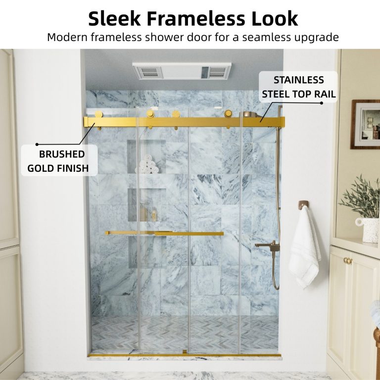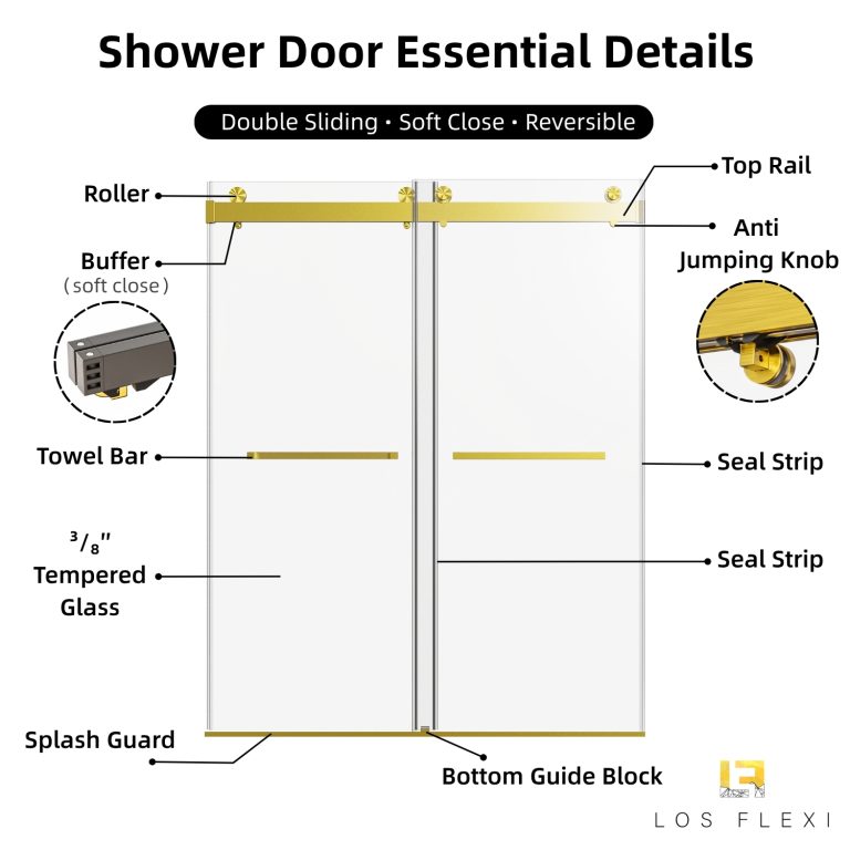 Elevate your bathroom with the Los Flexi double sliding shower door in a stunning brushed gold finish. Designed to complement modern bathrooms, this frameless door features durable 3/8″ tempered glass and a sleek design that adds a touch of elegance to your space.