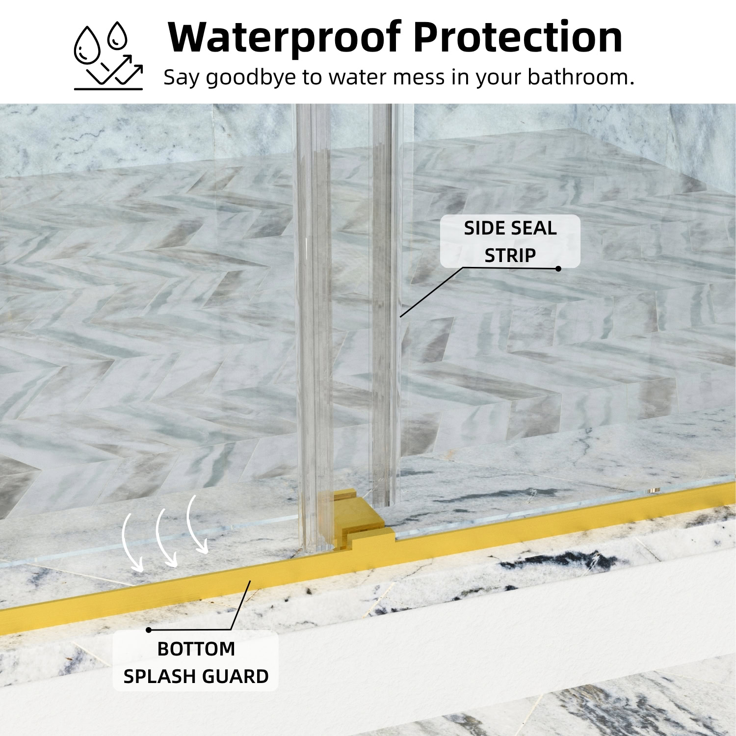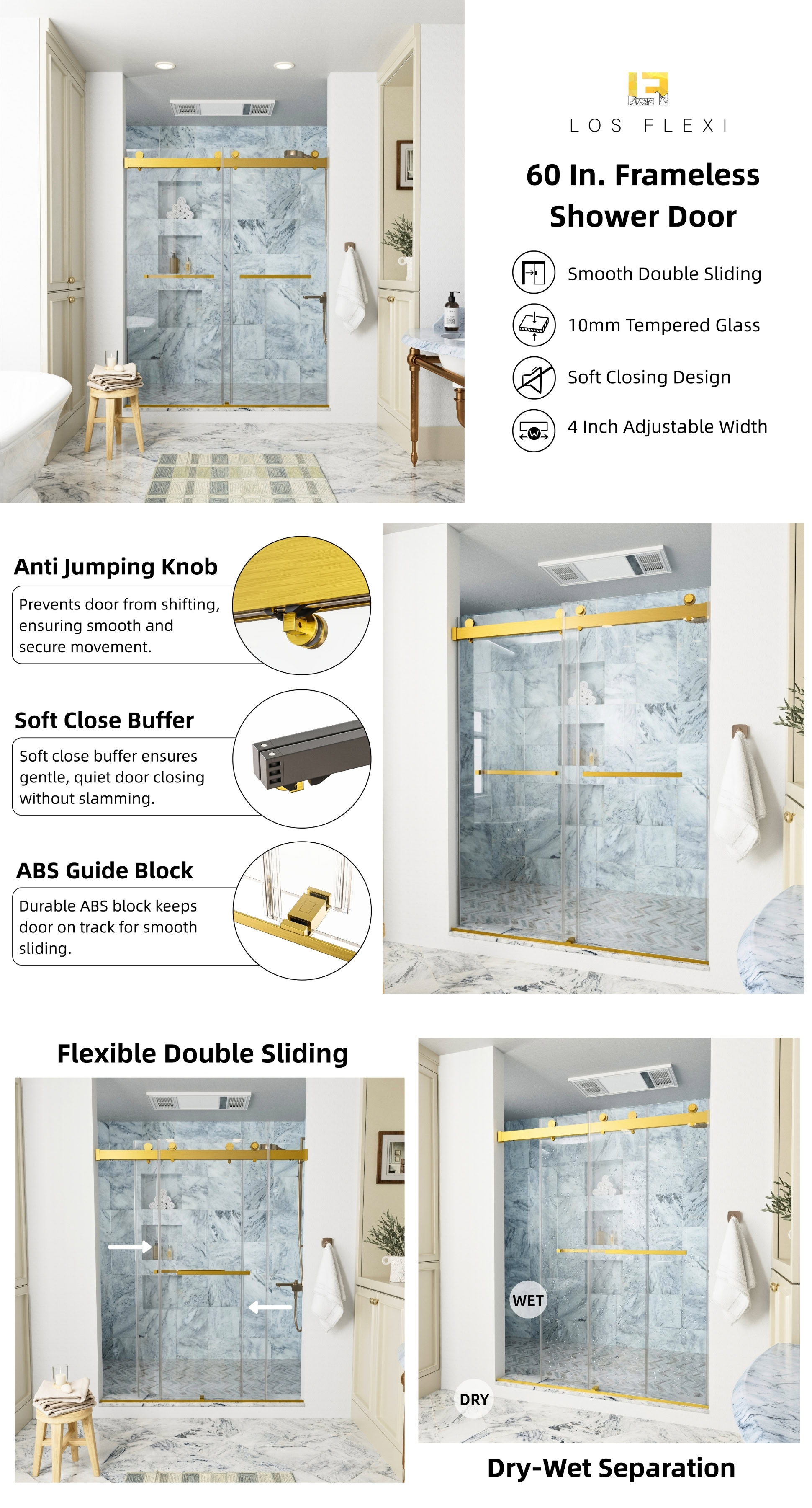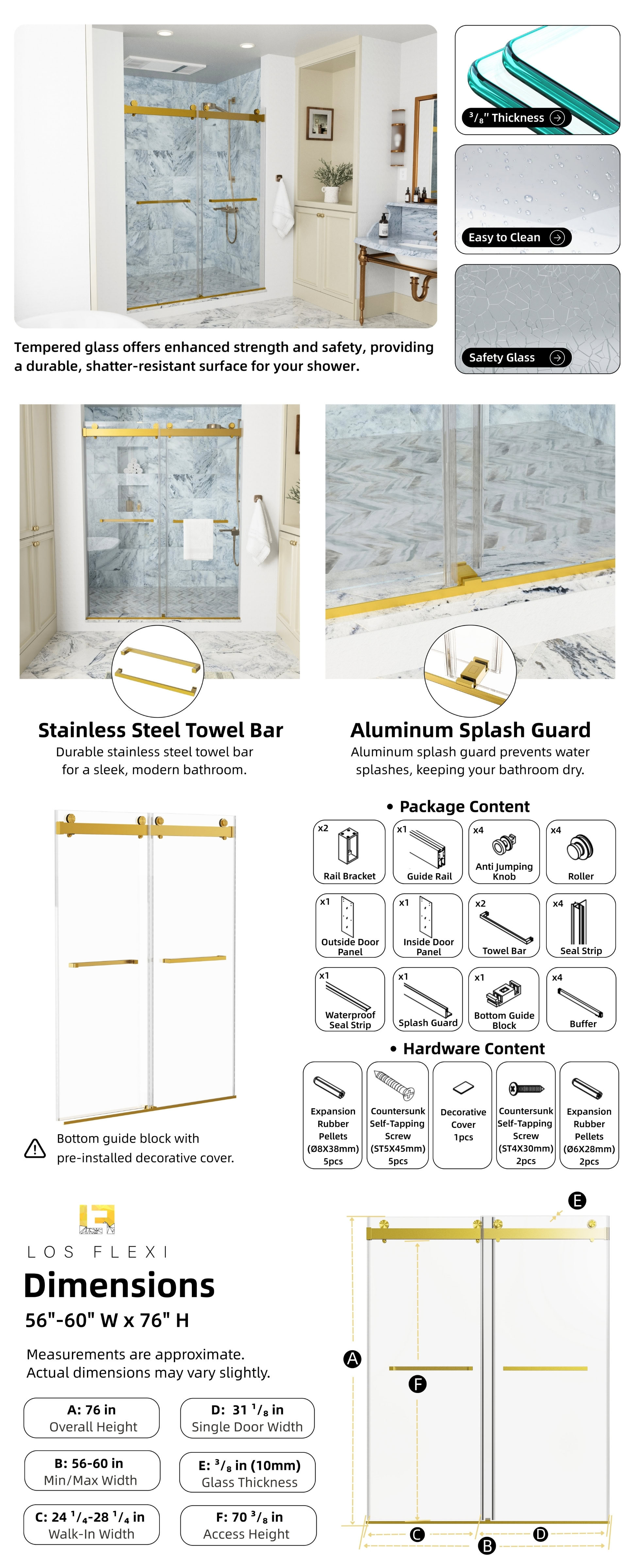 Los Flexi Sliding Shower Door Brushed Gold 60″W x 76″H with 3/8″ Tempered Glass