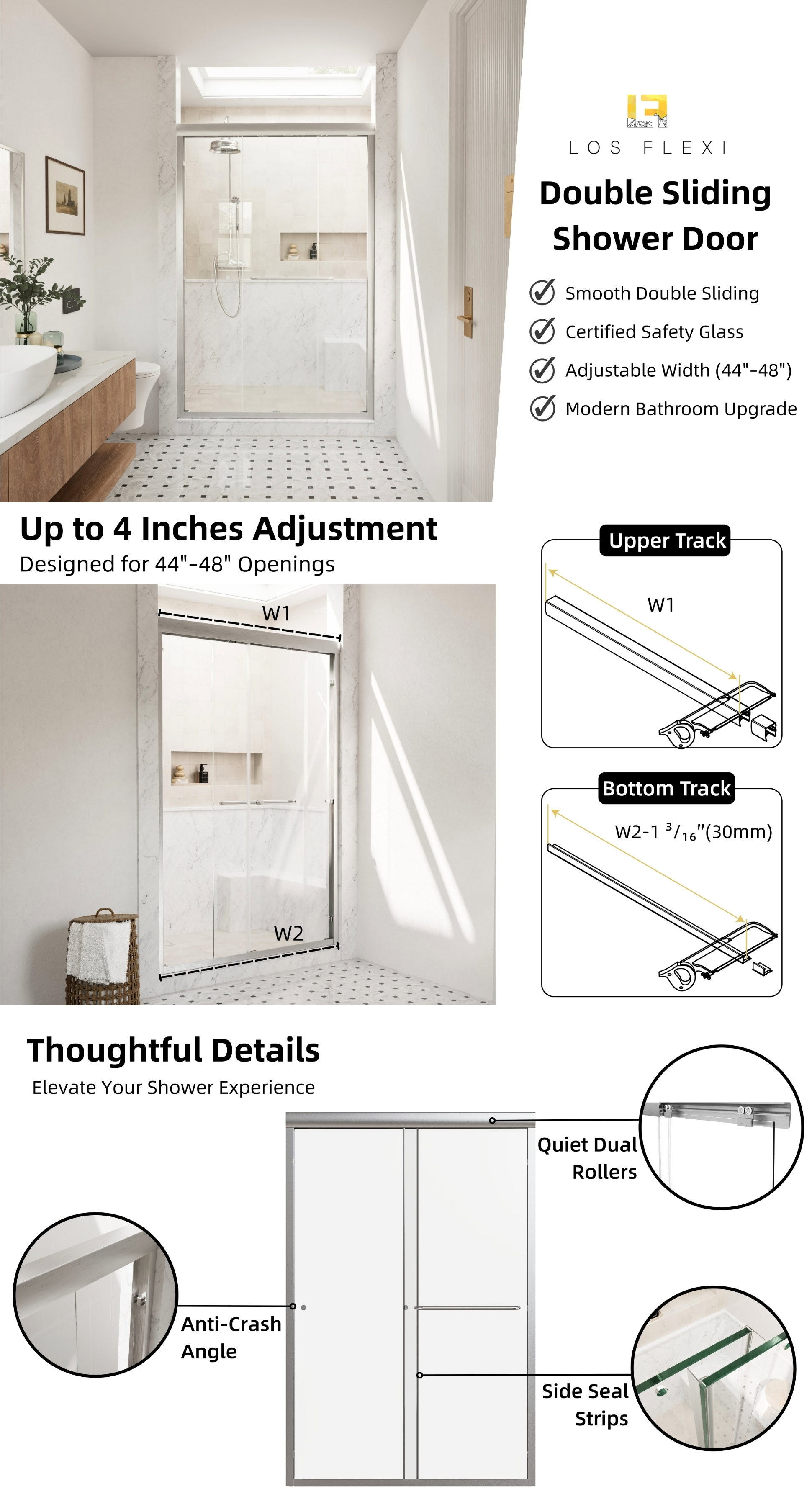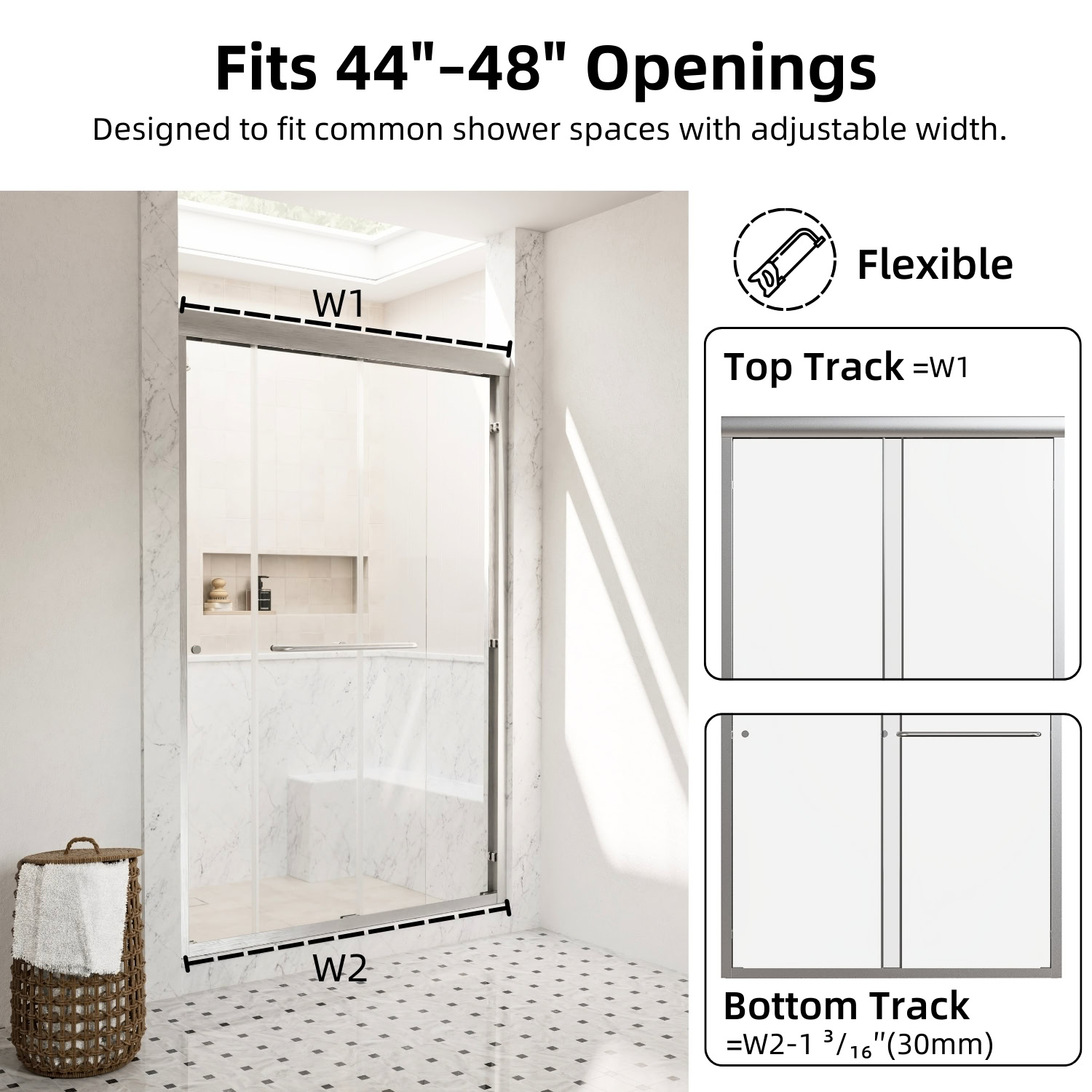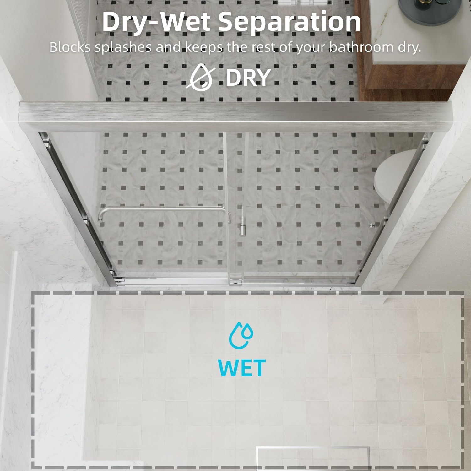 This 48-inch brushed nickel sliding shower door combines modern style with practical features. The double sliding design allows easy access from both sides, fitting openings between 44 and 48 inches wide, with a 4-inch adjustment range. The high-quality 6mm tempered glass ensures safety and durability, while its smooth surface makes cleaning a breeze.