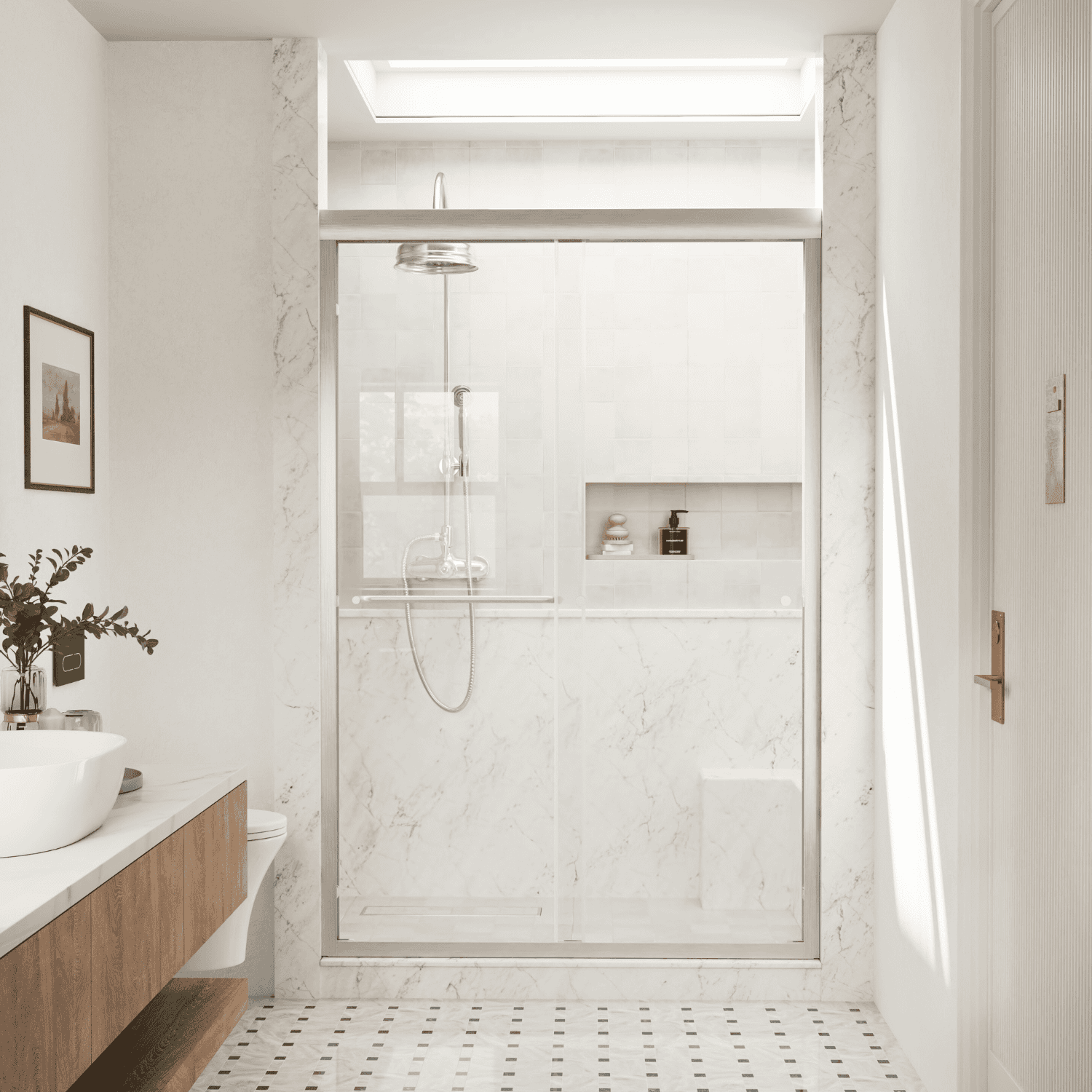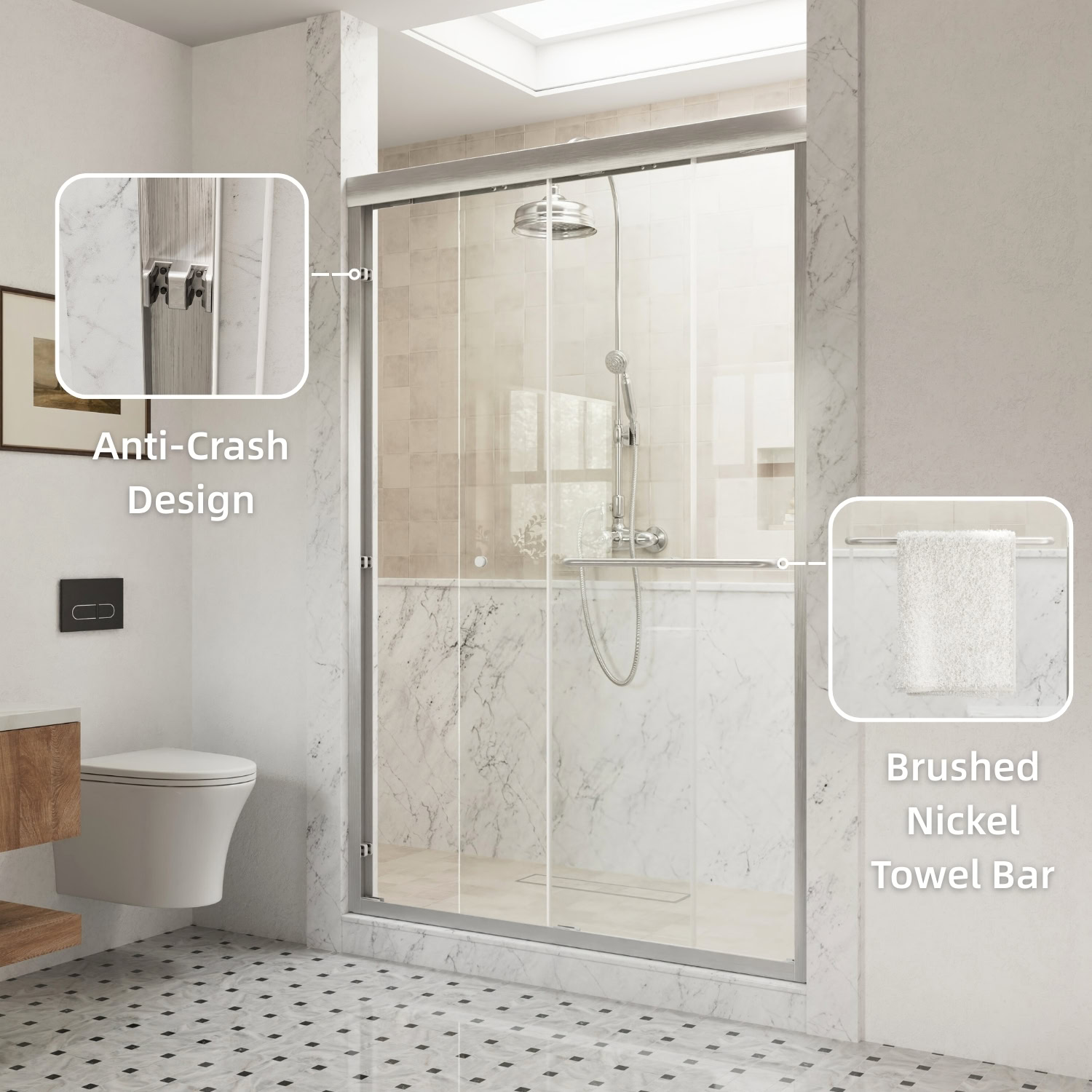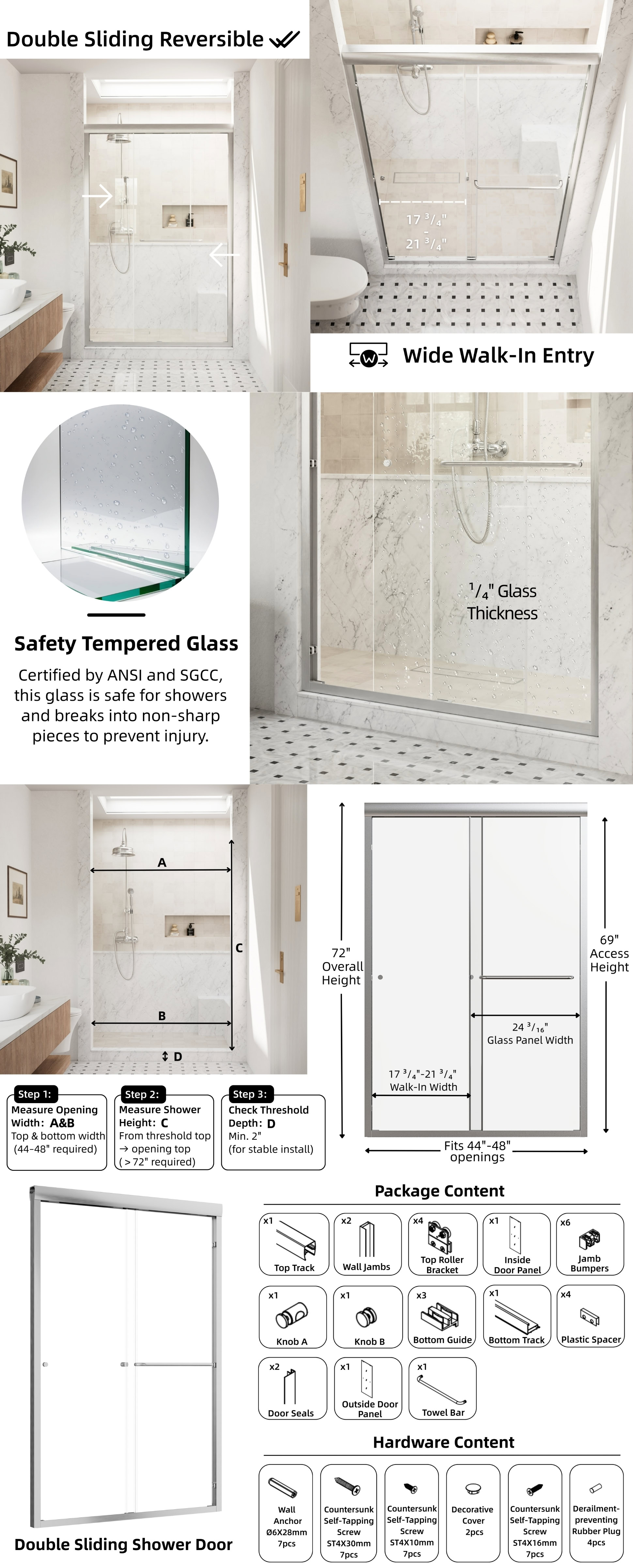 This 48-inch brushed nickel sliding shower door combines modern style with practical features. The double sliding design allows easy access from both sides, fitting openings between 44 and 48 inches wide, with a 4-inch adjustment range. The high-quality 6mm tempered glass ensures safety and durability, while its smooth surface makes cleaning a breeze.