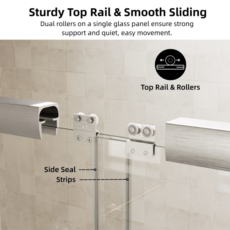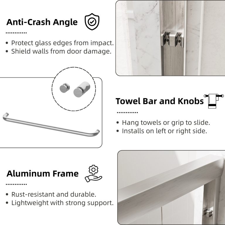 The sleek, semi-frameless brushed nickel frame offers corrosion resistance and complements contemporary bathroom decor. Seal strips and anti-collision corners effectively prevent water leakage and protect the glass edges from damage. This versatile glass shower door is designed to fit uneven walls, includes all necessary installation hardware, and is backed by a one-year limited warranty for added peace of mind.
