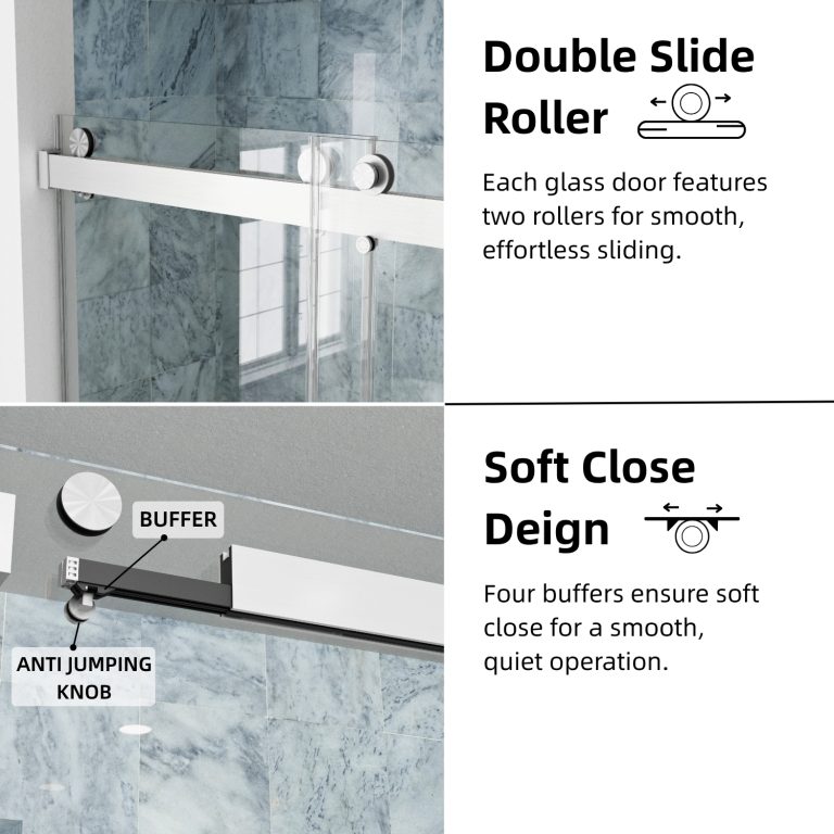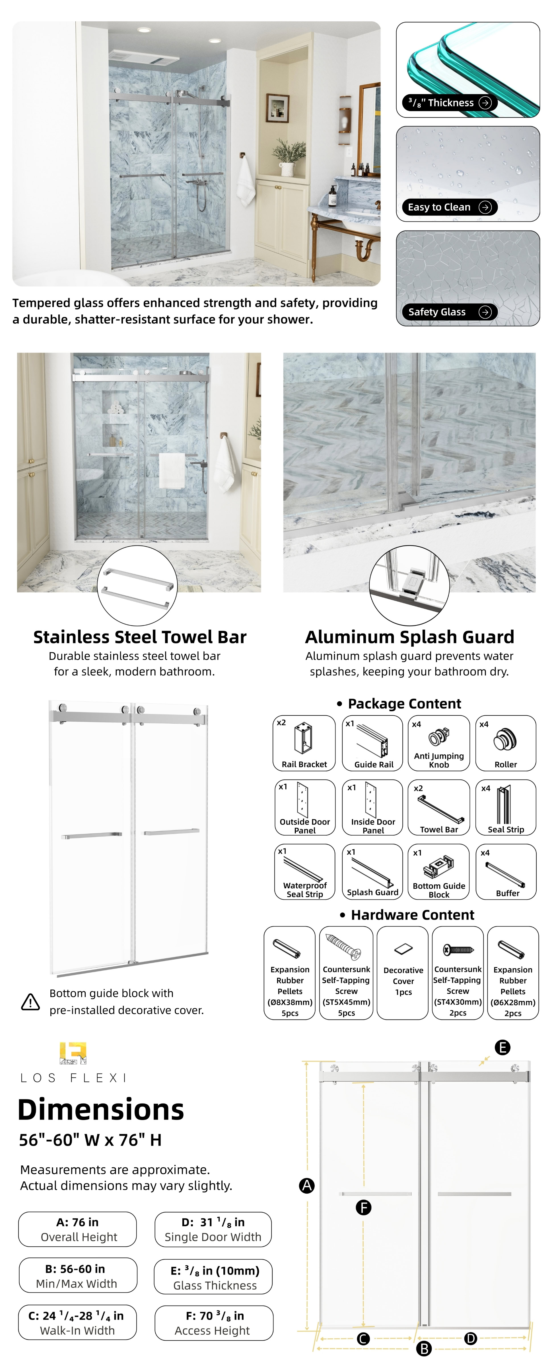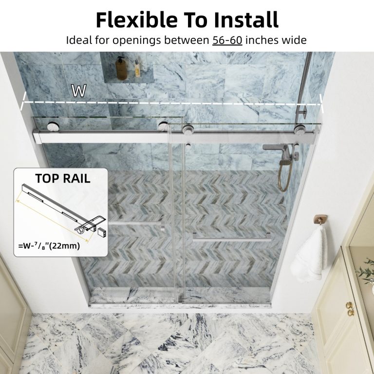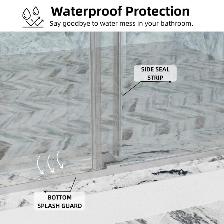 Crafted from 3/8″ (10mm) tempered glass, it delivers both strength and clarity. The added seal strips and splash guard provide effective water-tight protection, keeping your bathroom dry and enhancing the separation of wet and dry areas. Adjustable to fit openings from 50-60″, this shower door is backed by a 1-year warranty and includes stainless steel towel bars and all installation hardware.