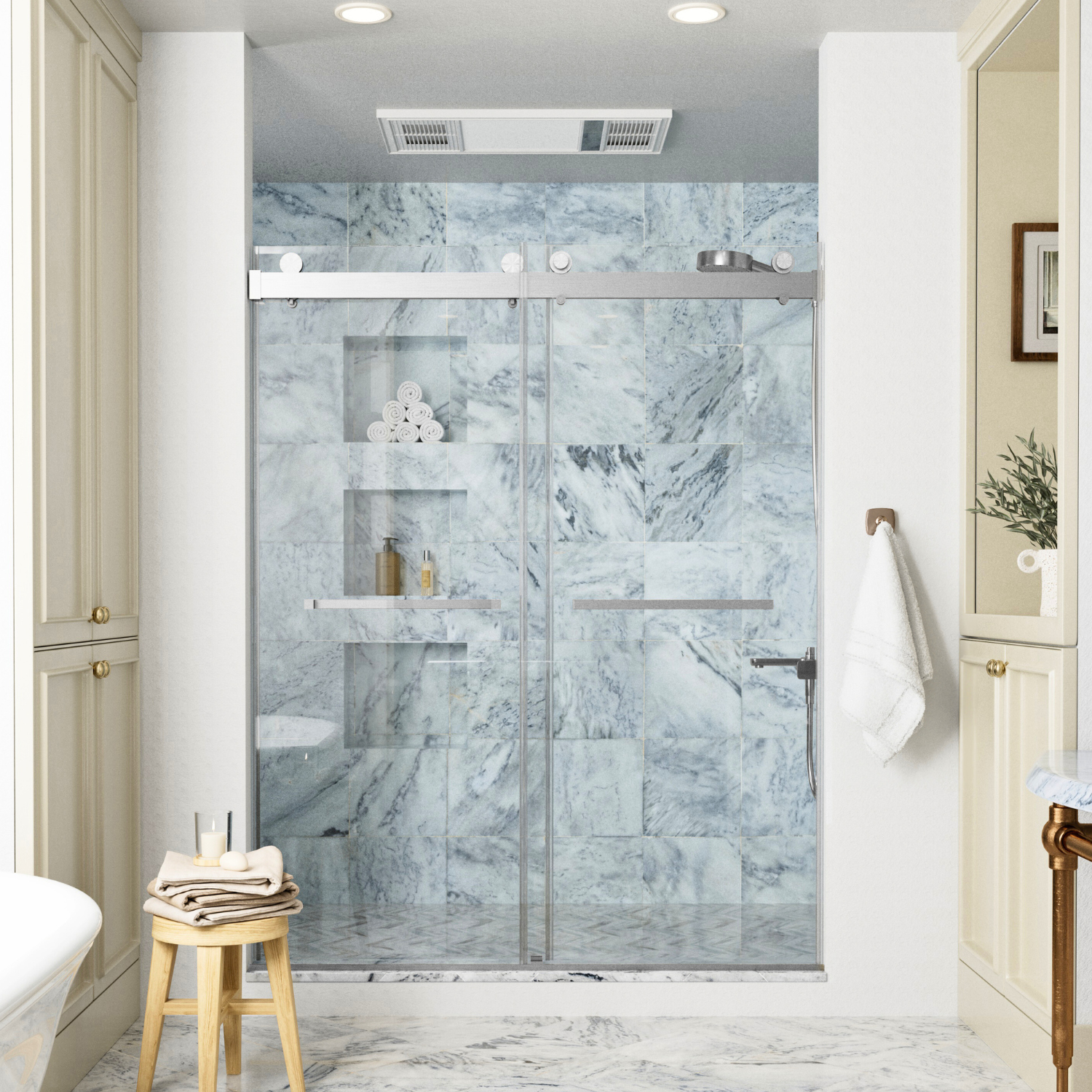 Transform your bathroom with the sleek Los Flexi frameless shower door in brushed nickel. This modern shower door combines style and functionality, featuring a durable brushed nickel finish that complements a variety of bathroom designs. The double sliding system, equipped with soft-close technology, ensures a smooth, quiet operation with no slamming.