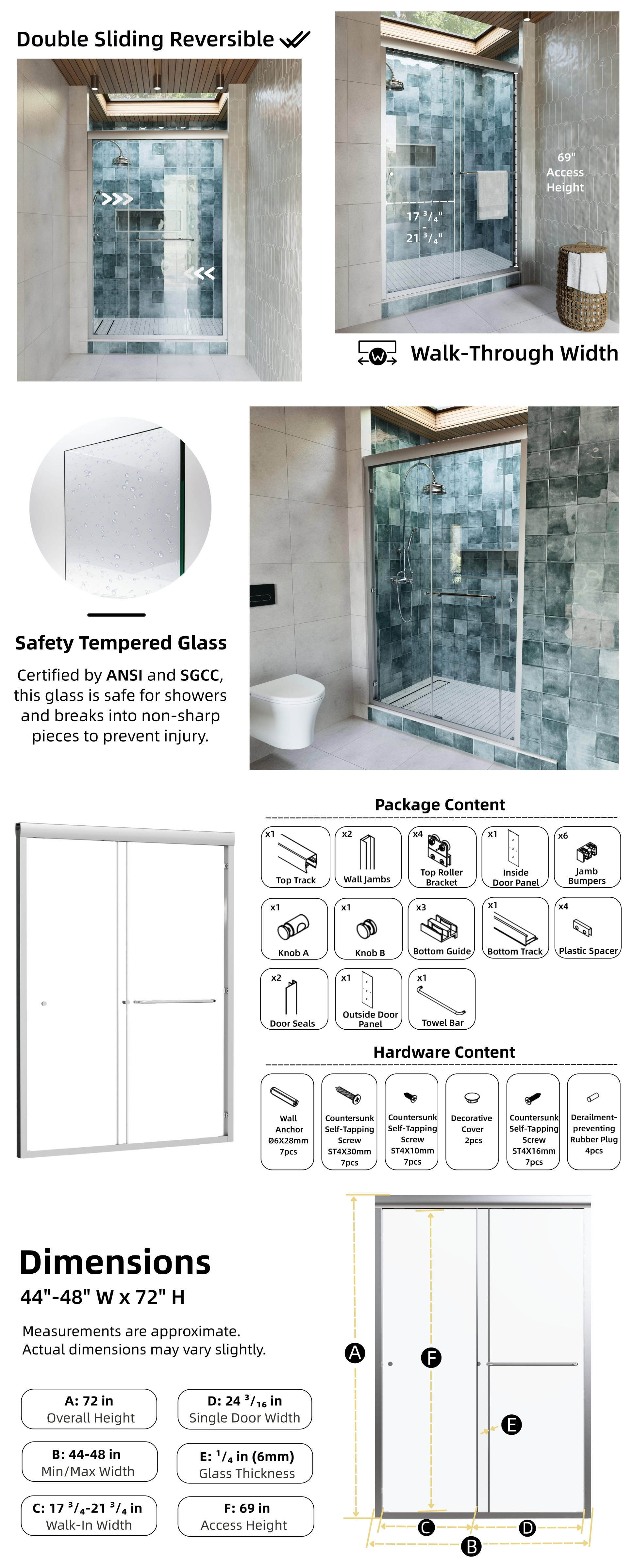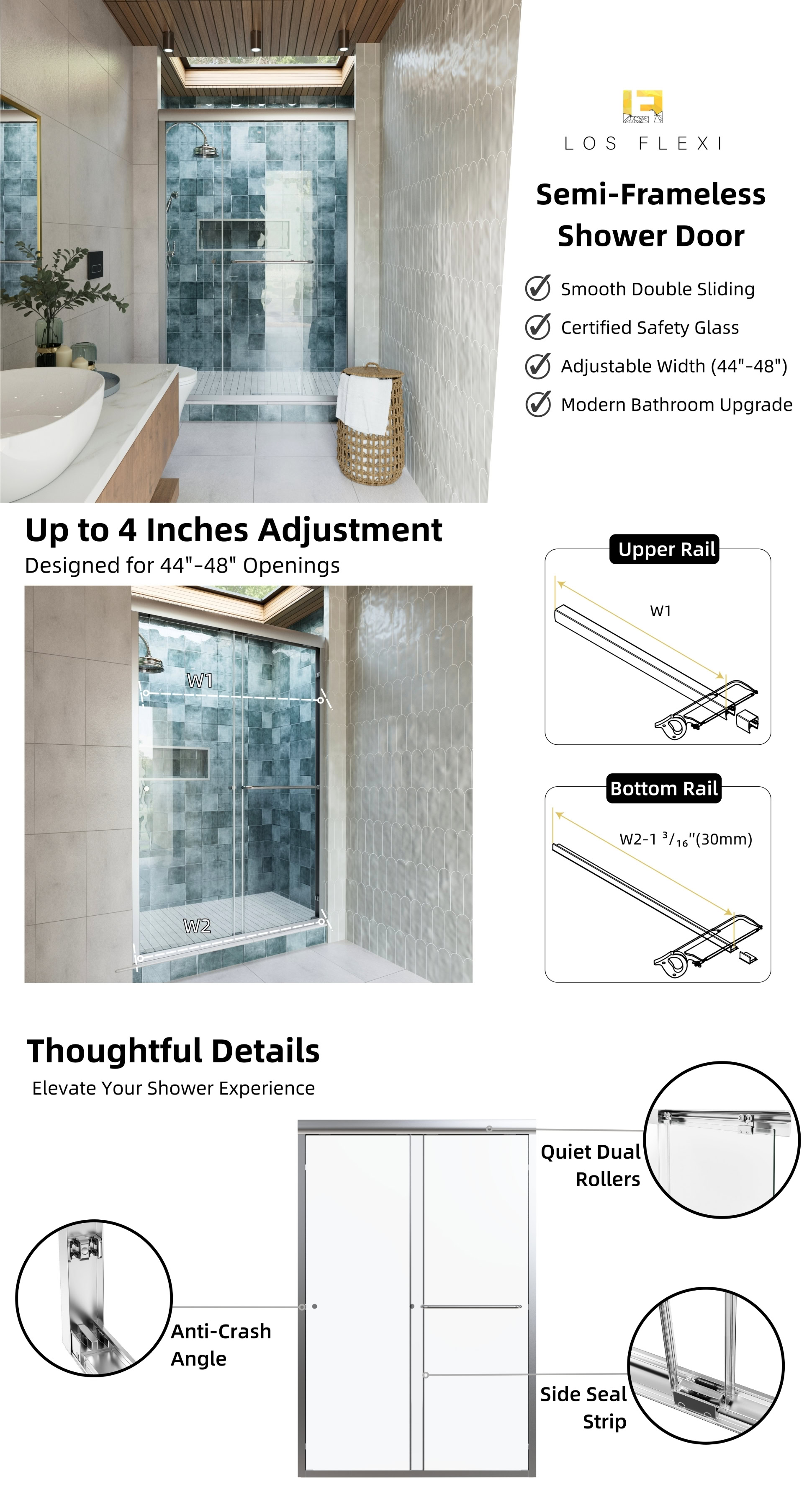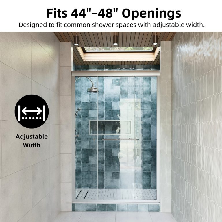 Engineered for ease of use, the door features dual rollers for smooth, effortless sliding from either side. Its adjustable width fits openings from 44 to 48 inches, and the side seal strips, along with anti-collision corners, help minimize water splashing and protect the glass. Backed by a 1-year warranty, this door ensures both functionality and long-term reliability.