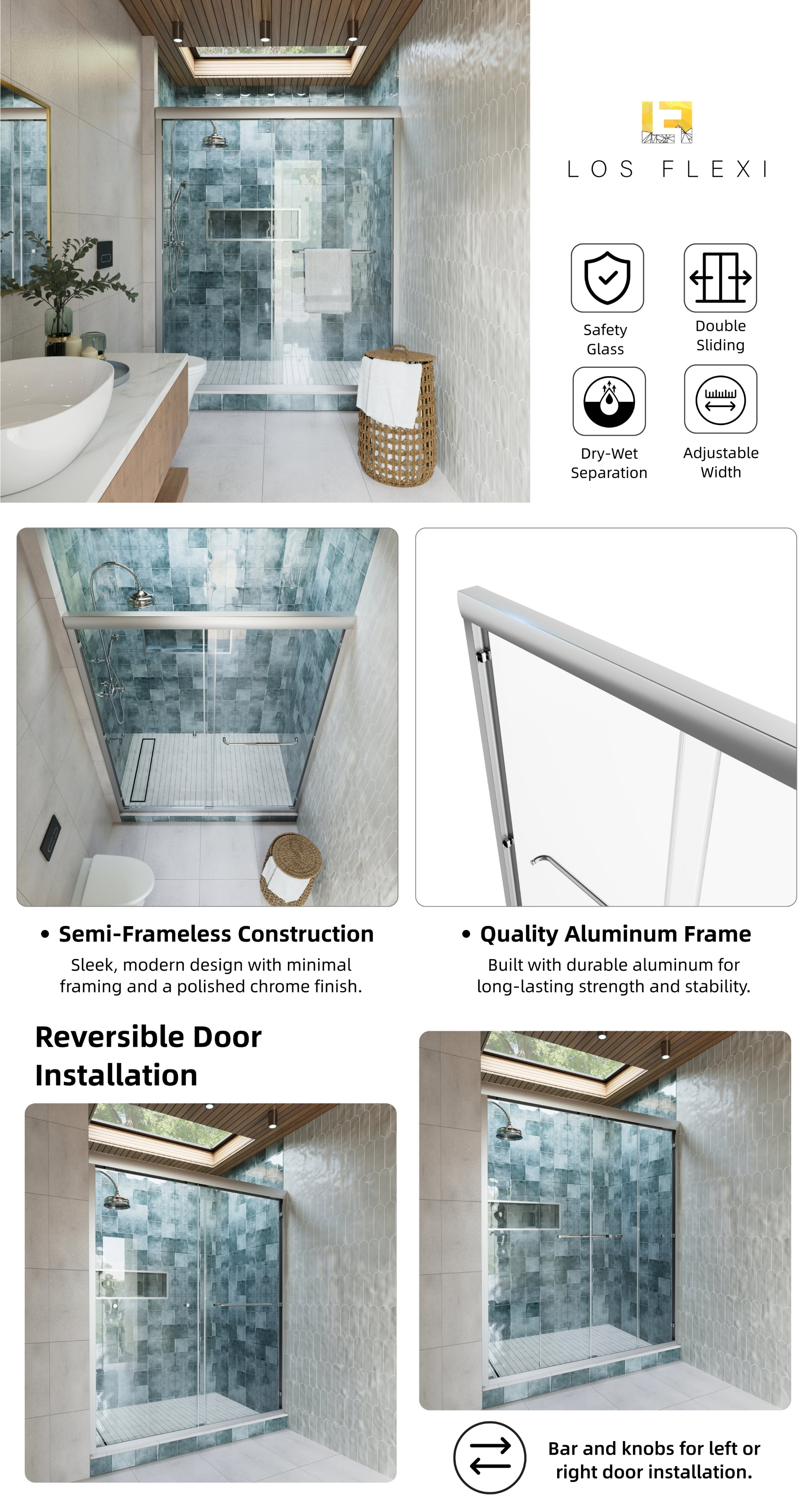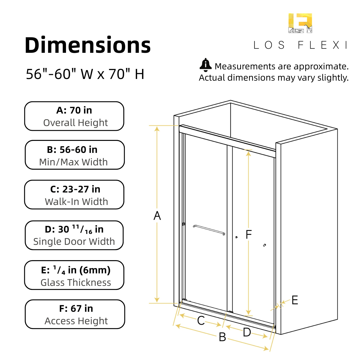 Los Flexi Sliding Shower Door Chrome 60″W x 70″H with 1/4″ Tempered Glass