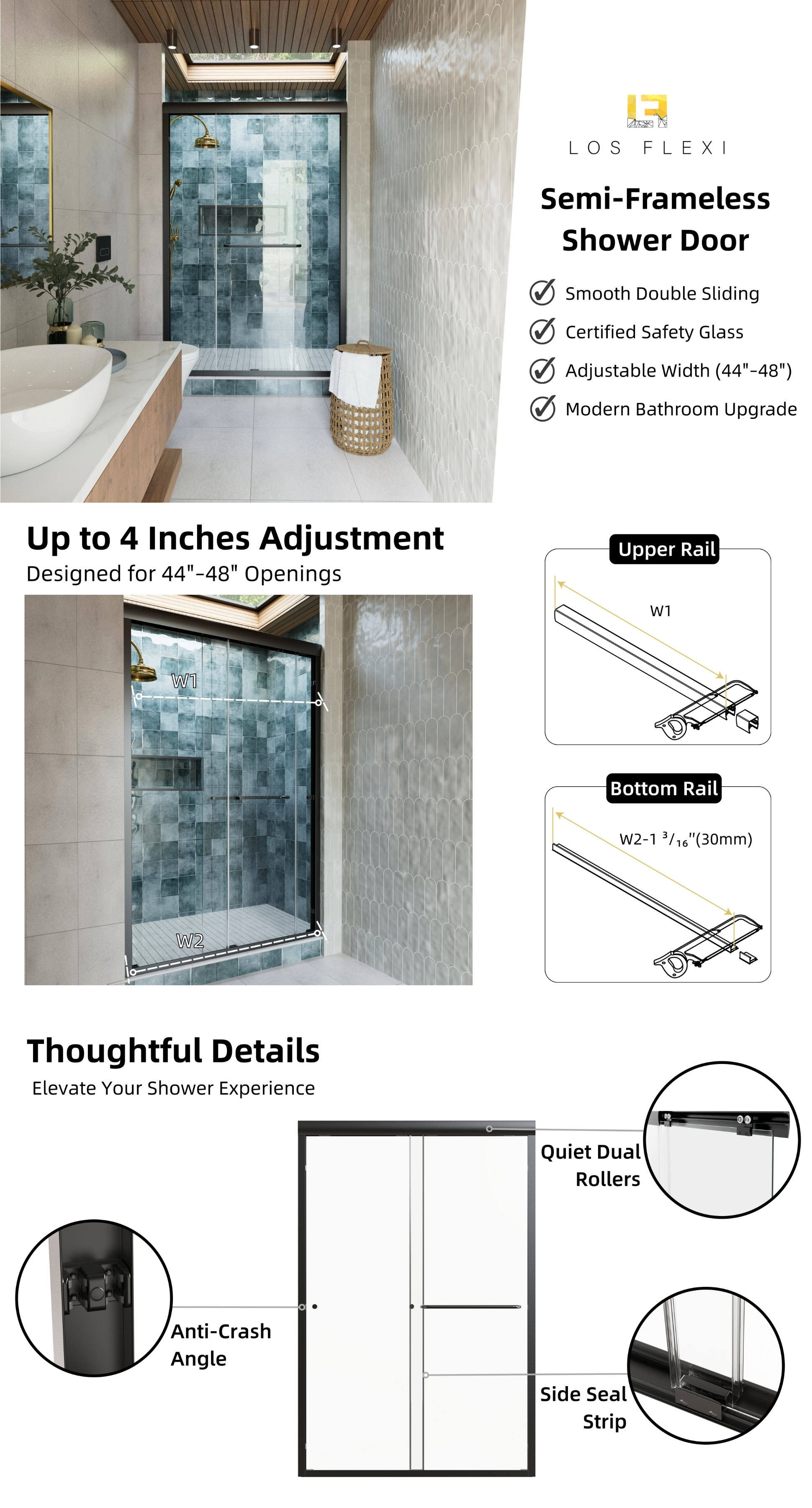 Los Flexi Sliding Shower Door Matte Black 48″W x 72″H with 1/4″ Tempered Glass