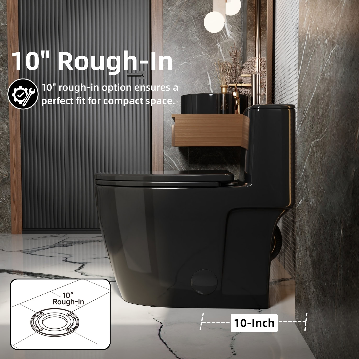 Featuring a 17.3-inch ADA-compliant seat height and an elongated bowl, this bathroom toilet offers added legroom and easier sitting and standing for a wide range of users. The efficient siphon jet dual-flush system (1.0/1.28 GPF) provides smooth, dependable flushing while helping conserve water. Built with a 10-inch rough-in, it allows closer wall placement to help maximize floor space, making it especially well suited for small bathrooms, apartments, and remodeling projects. A complete installation kit and a 2-year limited warranty are included for added confidence.