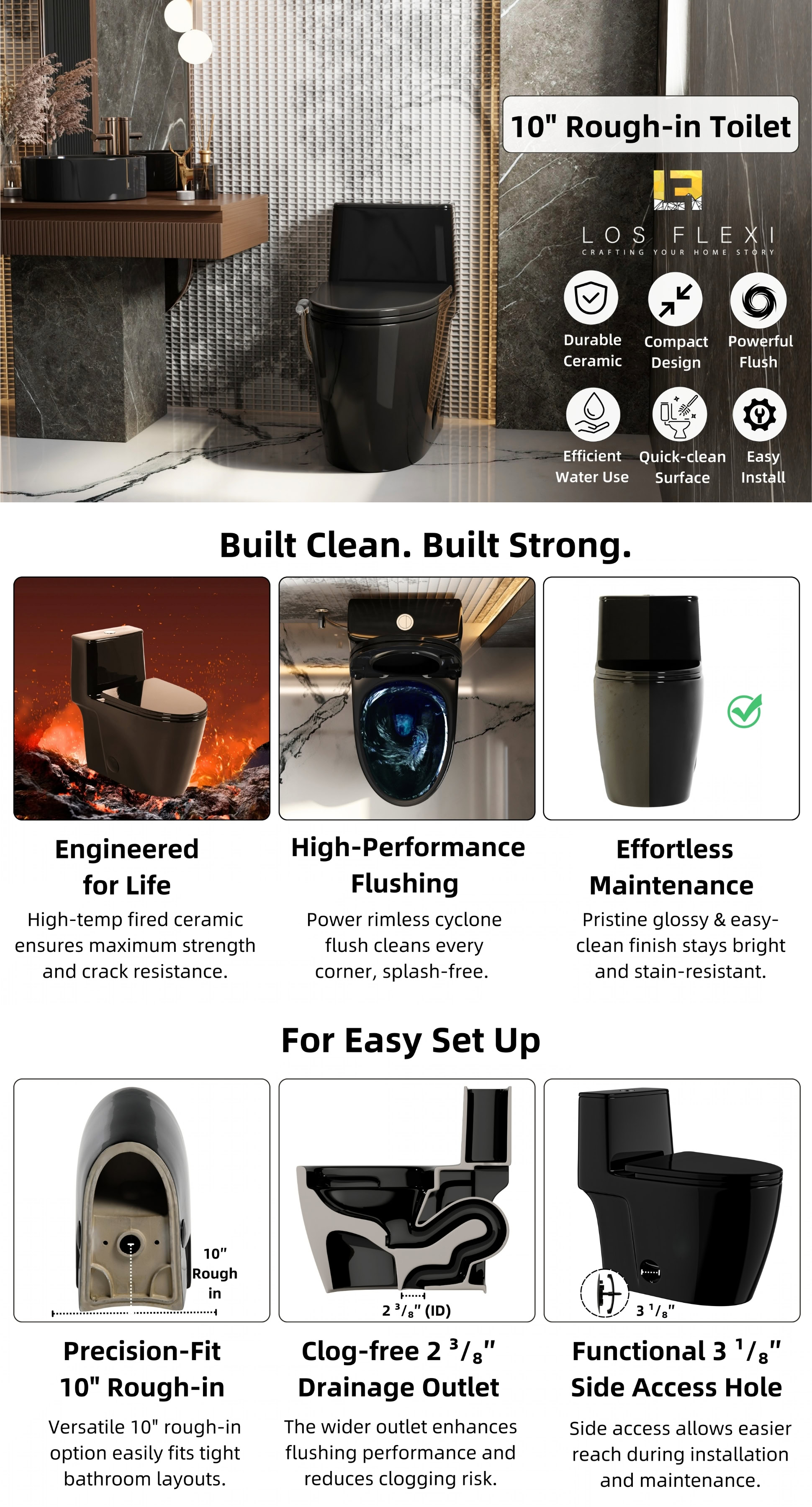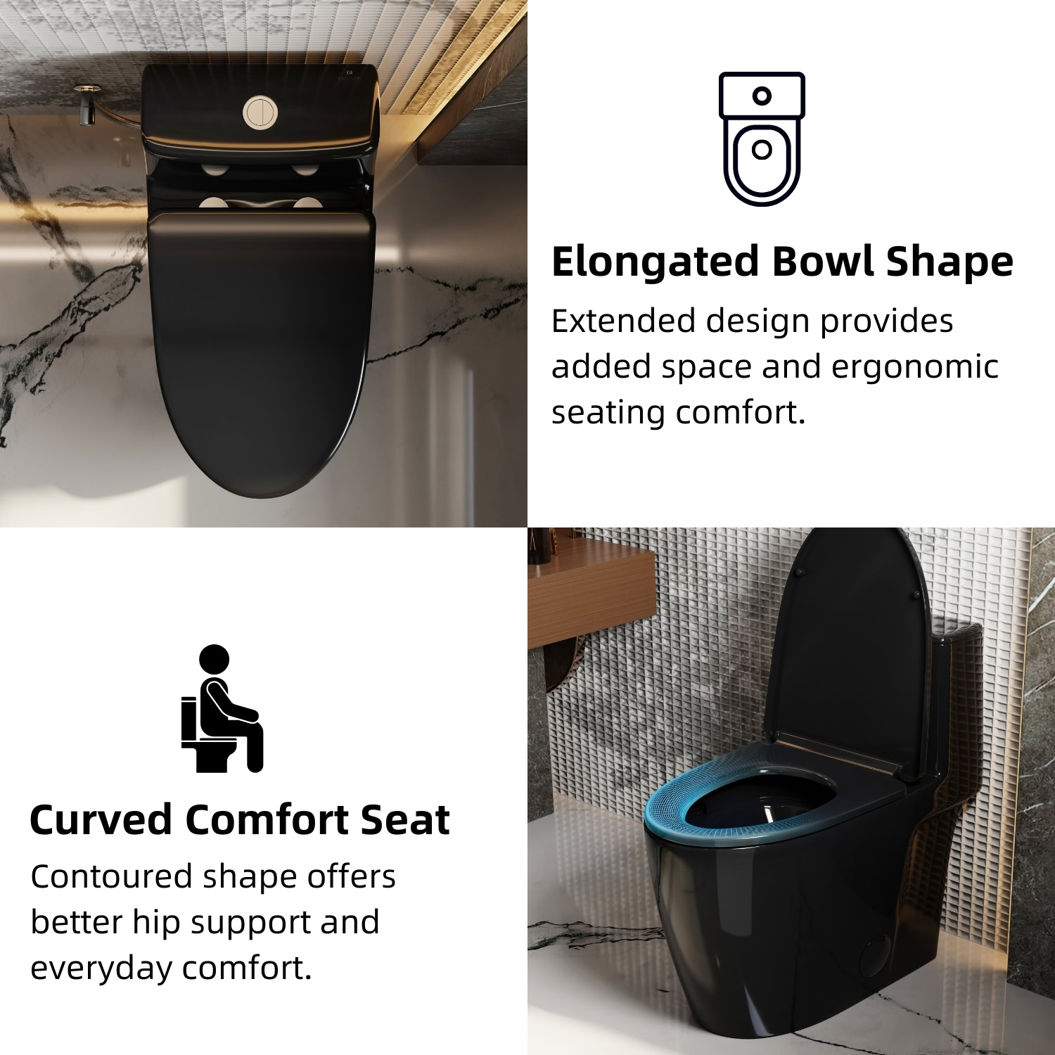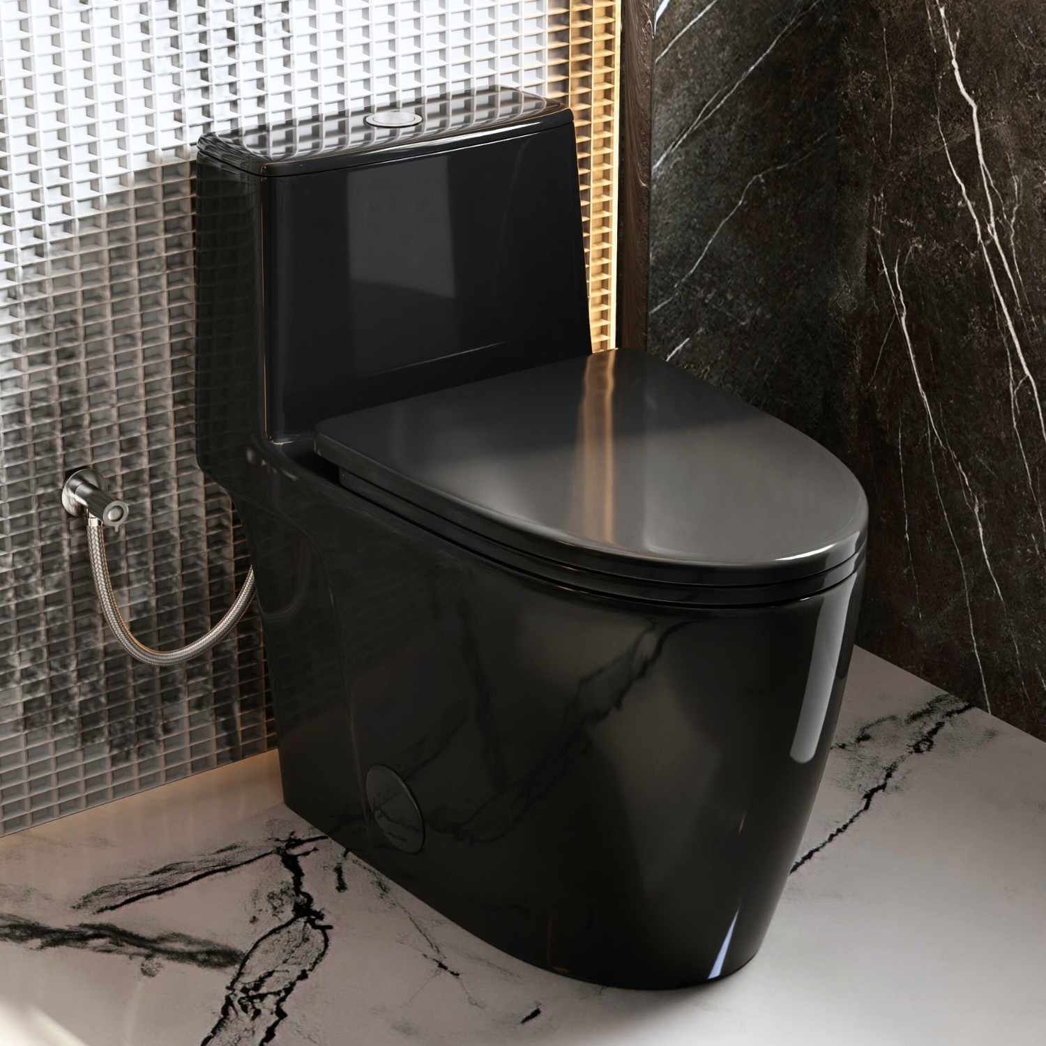 The Los Flexi glossy black elongated one-piece toilet brings a bold, modern statement to contemporary bathrooms while delivering everyday comfort and efficiency. Finished in a high-gloss black ceramic, it adds depth and refinement to design-forward spaces while maintaining a smooth, easy-to-clean surface. The streamlined, full-skirted body and one-piece construction create a seamless look with fewer crevices for simpler maintenance.