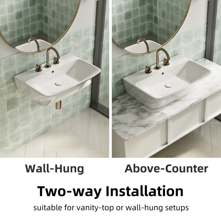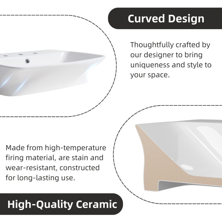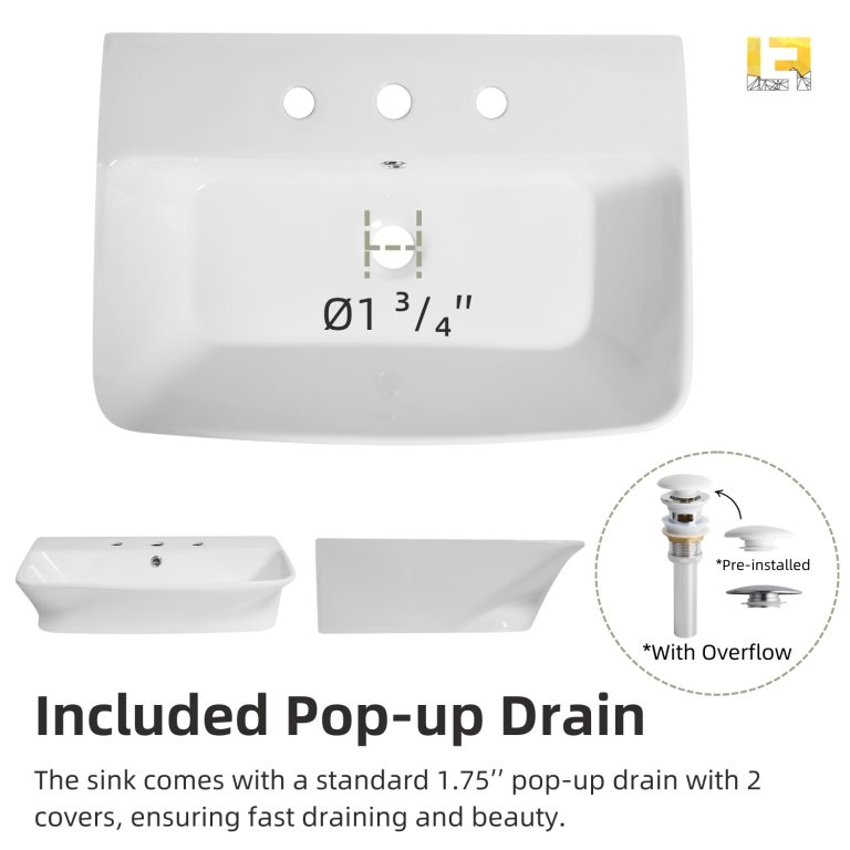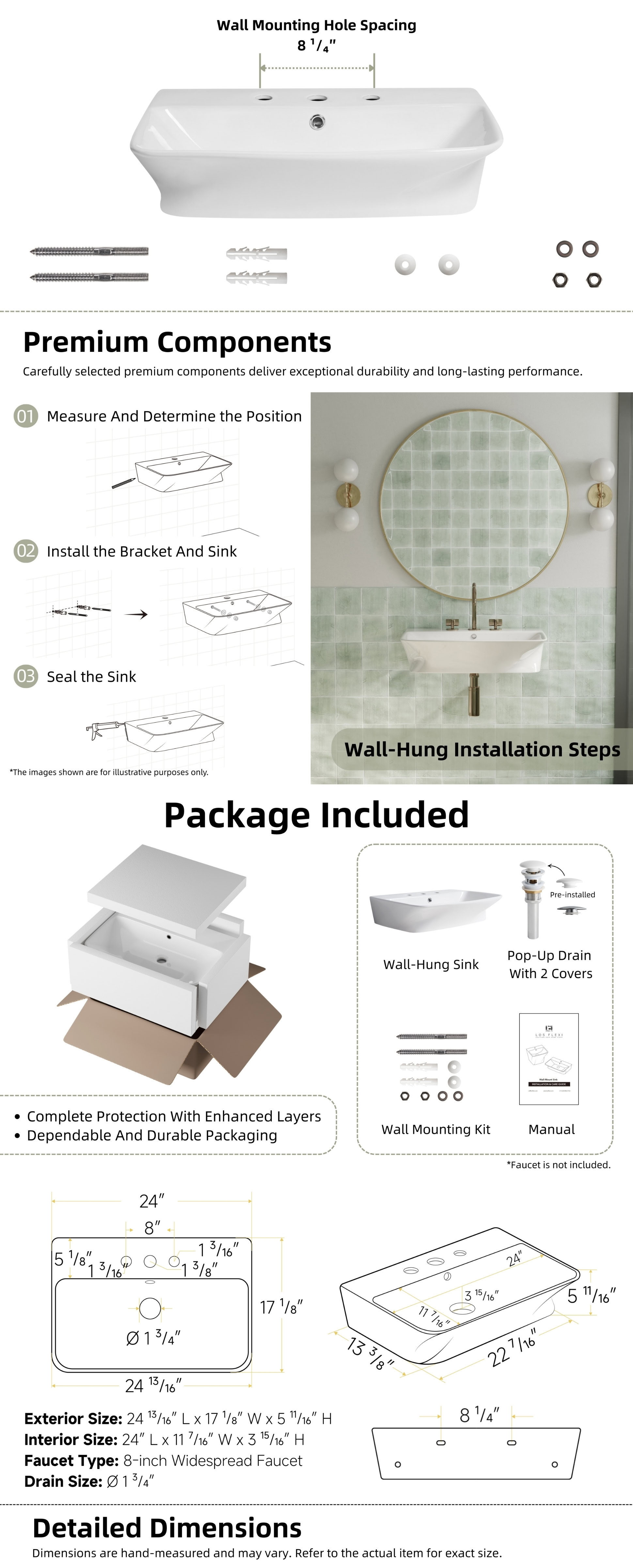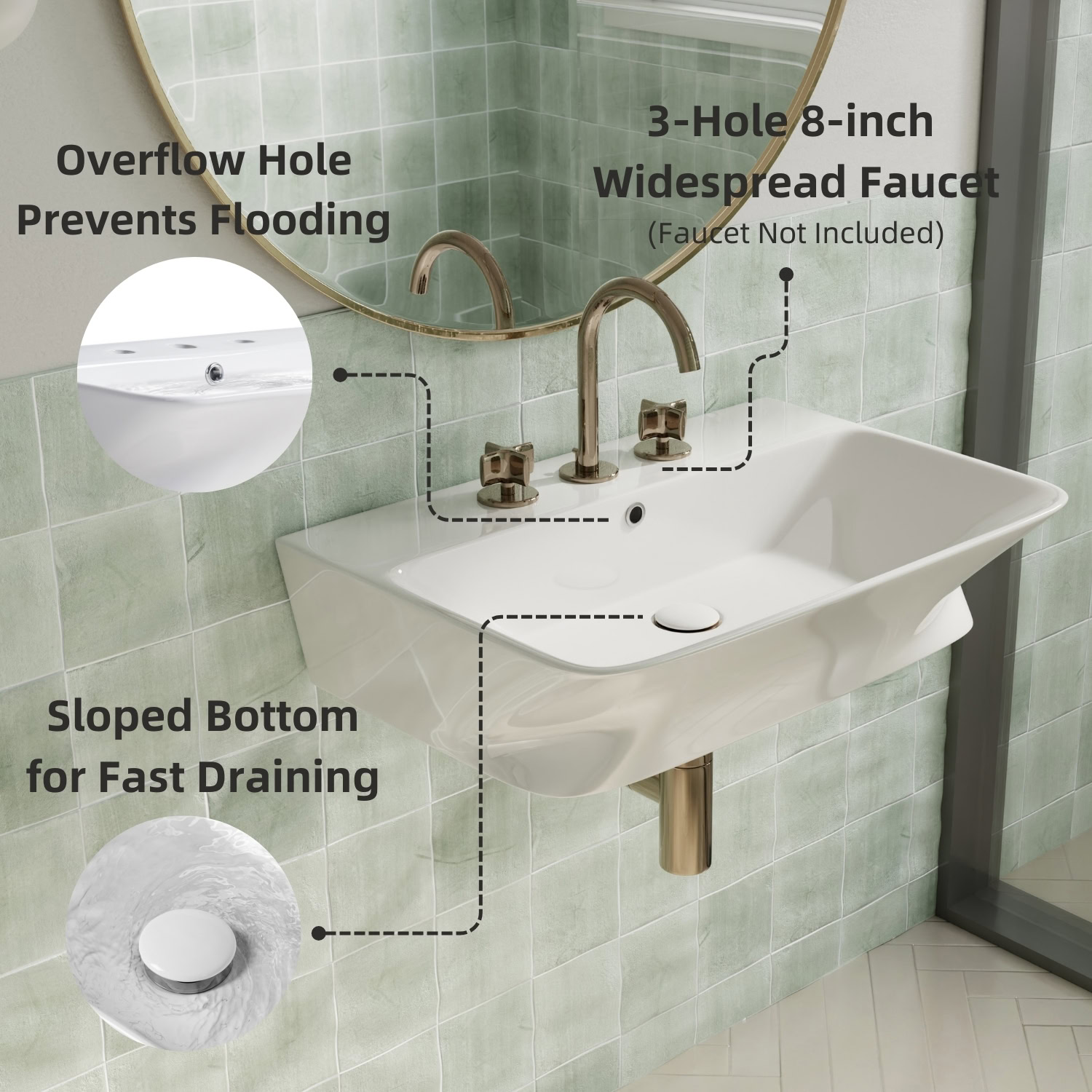 This wall hung sink is equipped with three pre-drilled 8-inch faucet holes, offering flexibility to pair with various widespread faucets, while the concealed rear overflow effectively manages excess water. Made from high-quality white ceramic, it is not only beautiful but also sturdy and durable. It ships carefully in multi-layer packaging to ensure safe delivery. We offer a 2-year limited warranty and provide professional customer service to support a smooth, worry-free experience.
