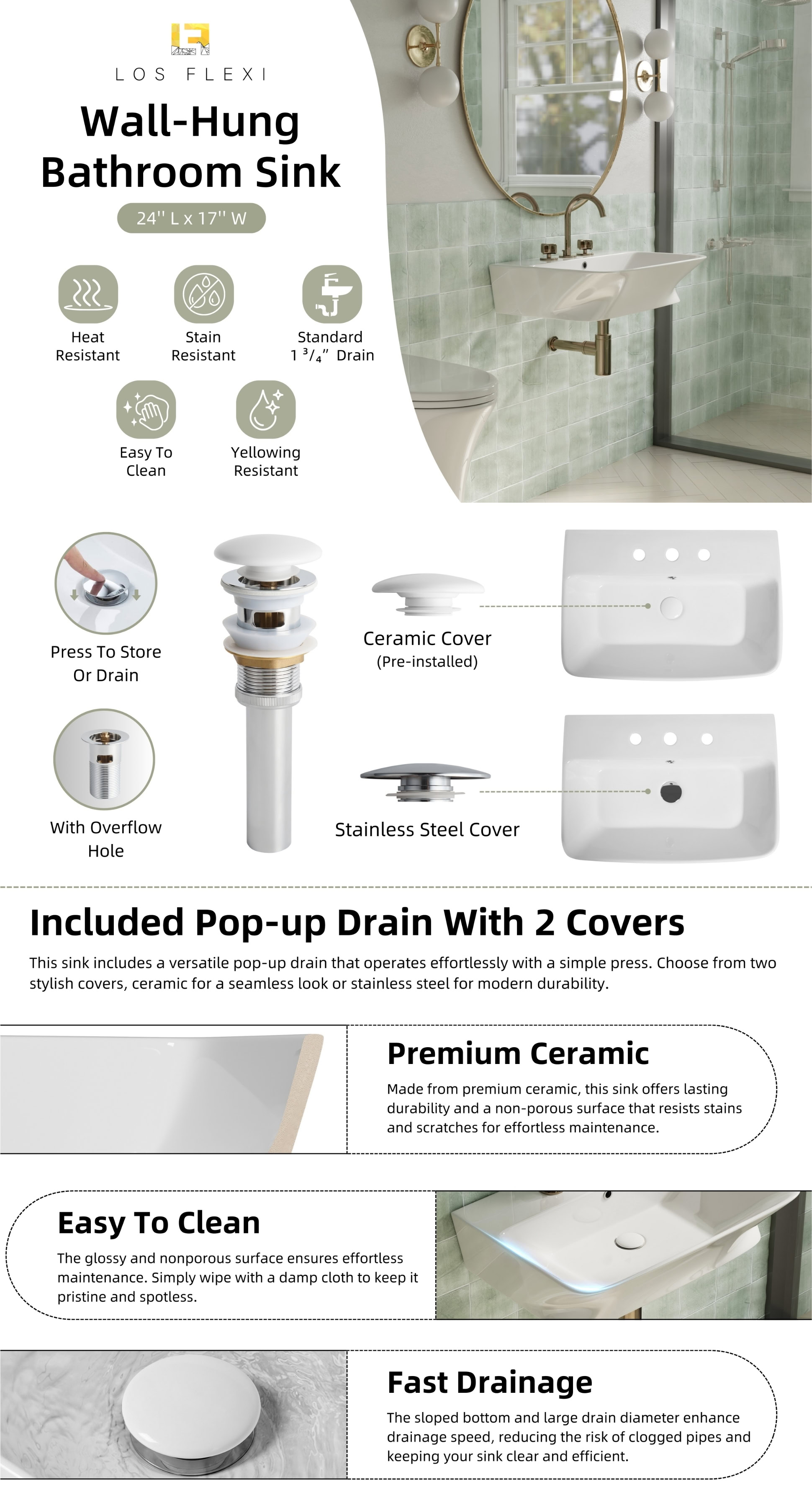 Los Flexi White Ceramic Wall Mount Bathroom Sink 24″L X 17″W