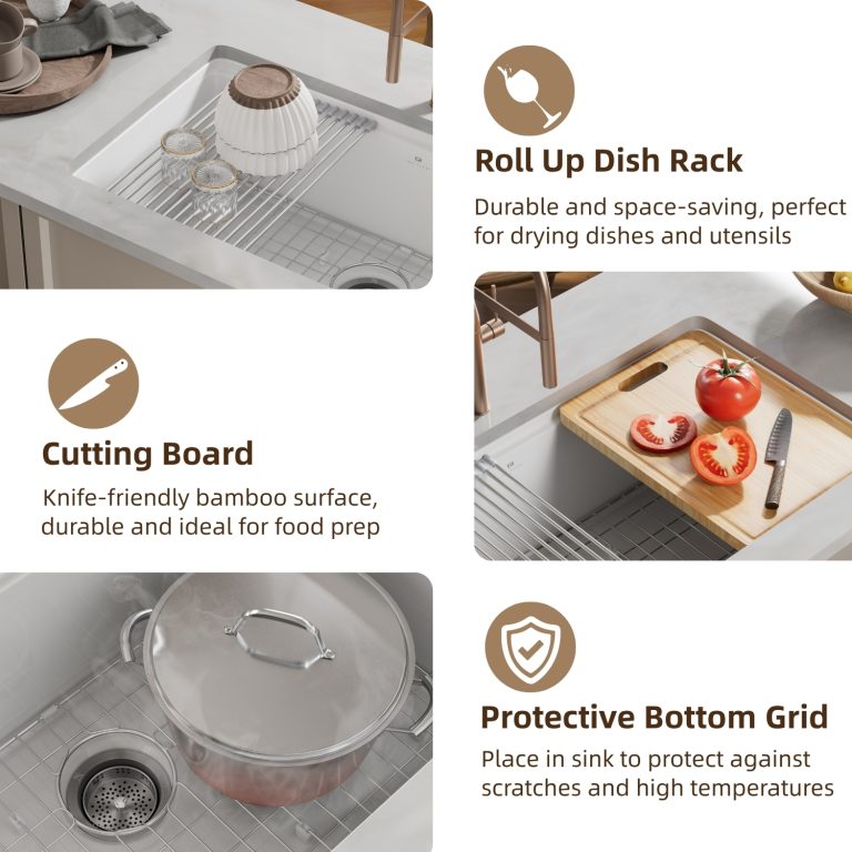 This versatile workstation sink, crafted from high-quality fireclay, offers superior resistance to heat, yellowing, stains, and scratches. Its sleek, rectangular shape features a thick, durable rim and smooth walls, combining structural stability with a clean, minimal aesthetic that complements both modern and traditional kitchens.