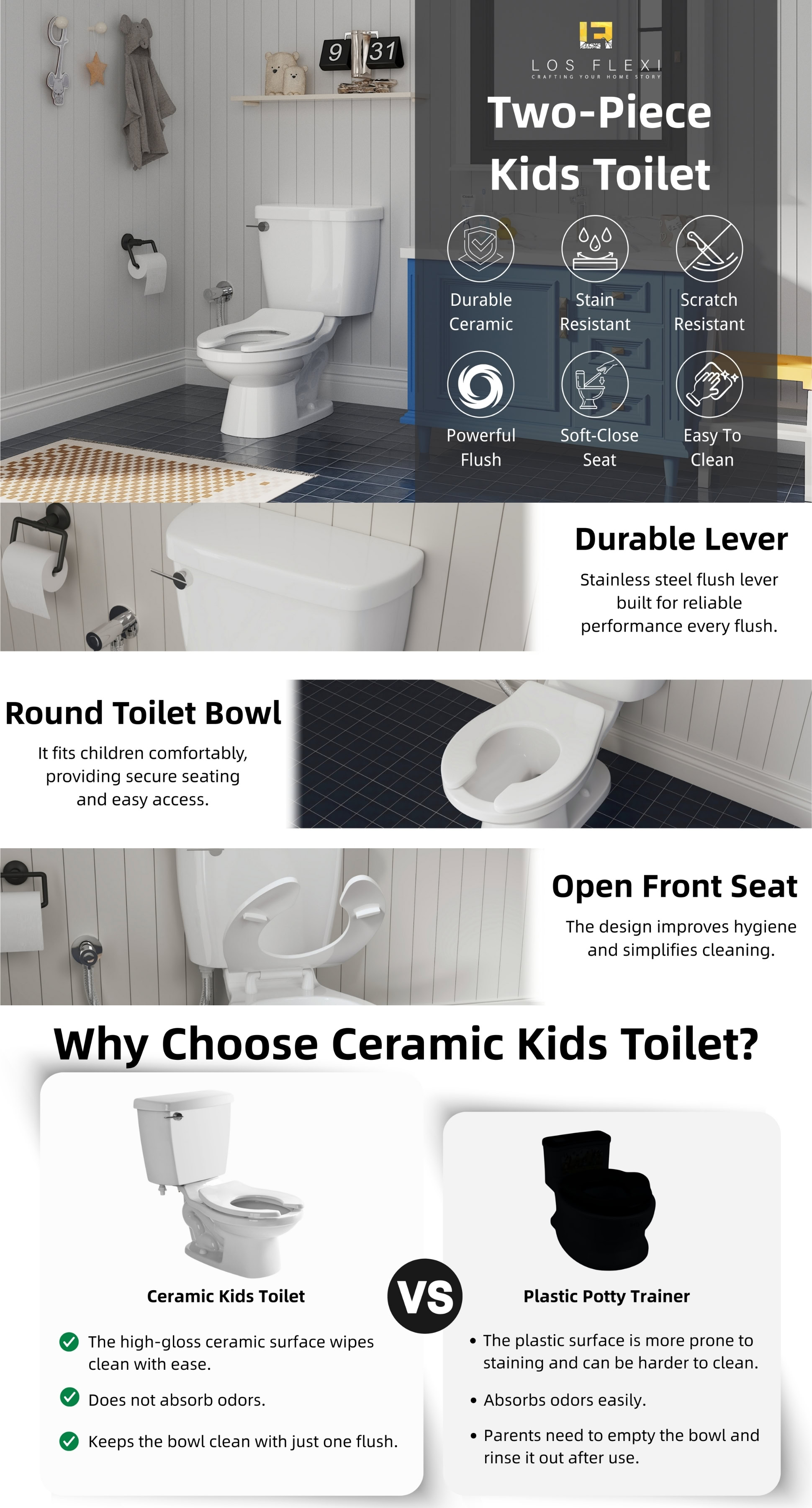 Transitioning to the big bathroom is a huge step for any child. Our round two-piece kids toilet is built just for them! With a kid-friendly 11.69-inch seat height, it’s an ideal size for toddlers and children ages 2 to 8, helping them feel safe and confident as they learn to go to the bathroom all by themselves. The kids toilet features a strong, efficient flush that uses only 1.28 gallons of water, designed to stay clean with a smooth, glazed surface that prevents waste from sticking. The round bowl and open-front seat are specially shaped for better hygiene, making cleanup easier for parents. Made from high-quality, shiny white ceramic, this durable baby toilet is suitable for busy homes, schools, or daycares. It fits a standard 10-inch rough-in, so installation is quick and easy without the need for special plumbing. Everything you need for a simple setup is included, giving your child a bathroom they can finally reach!