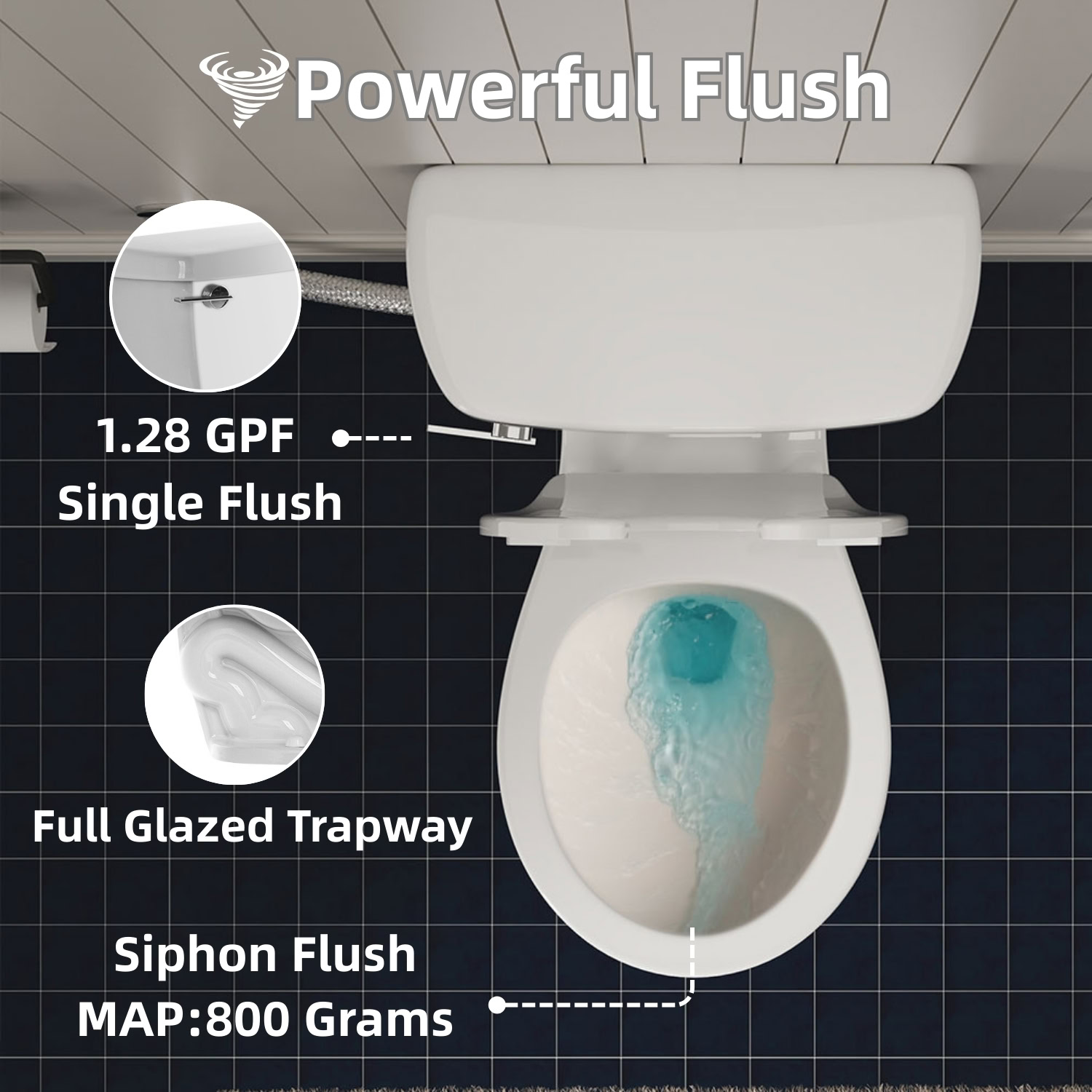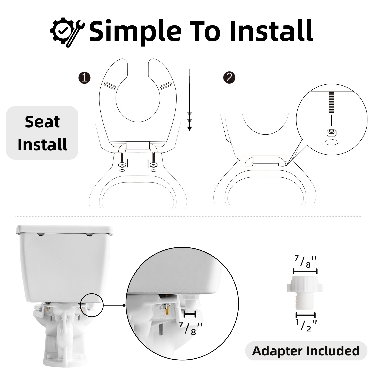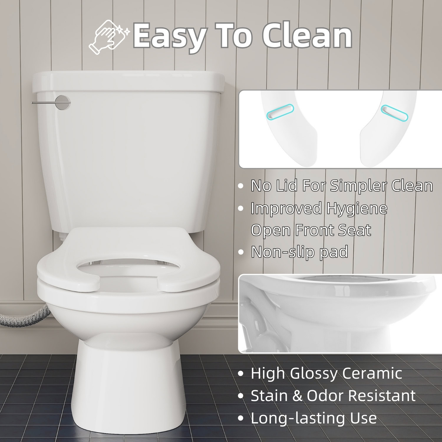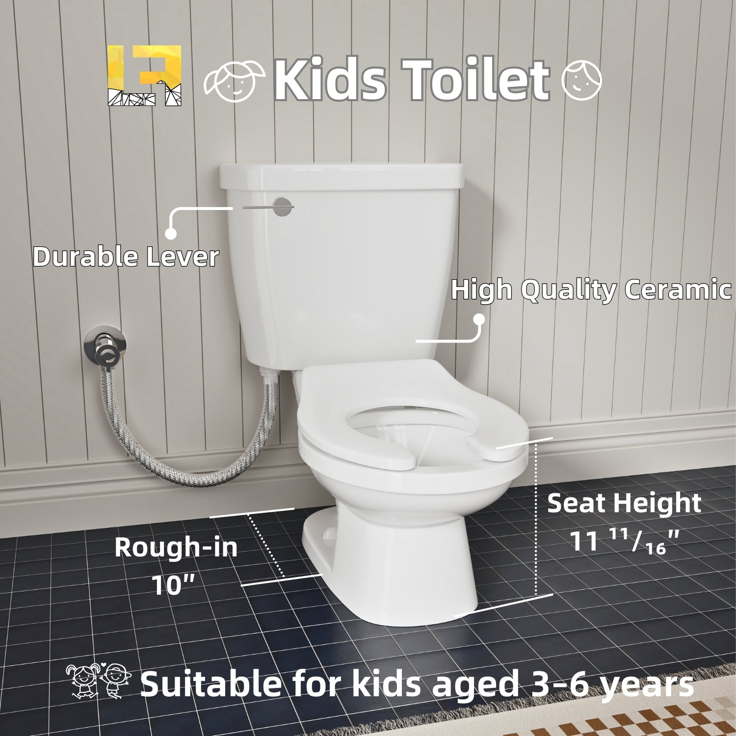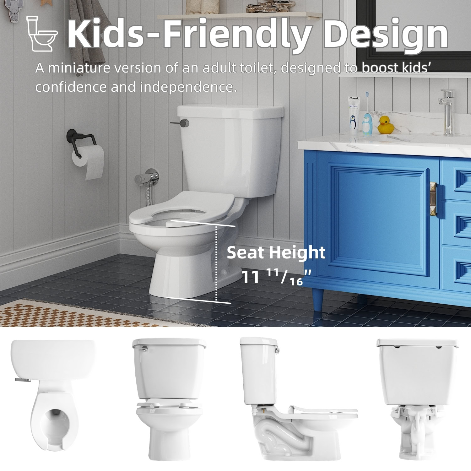 Transitioning to the big bathroom is a huge step for any child. Our round two-piece kids toilet is built just for them! With a kid-friendly 11.69-inch seat height, it’s an ideal size for toddlers and children ages 2 to 8, helping them feel safe and confident as they learn to go to the bathroom all by themselves. The kids toilet features a strong, efficient flush that uses only 1.28 gallons of water, designed to stay clean with a smooth, glazed surface that prevents waste from sticking. The round bowl and open-front seat are specially shaped for better hygiene, making cleanup easier for parents. Made from high-quality, shiny white ceramic, this durable baby toilet is suitable for busy homes, schools, or daycares. It fits a standard 10-inch rough-in, so installation is quick and easy without the need for special plumbing. Everything you need for a simple setup is included, giving your child a bathroom they can finally reach!