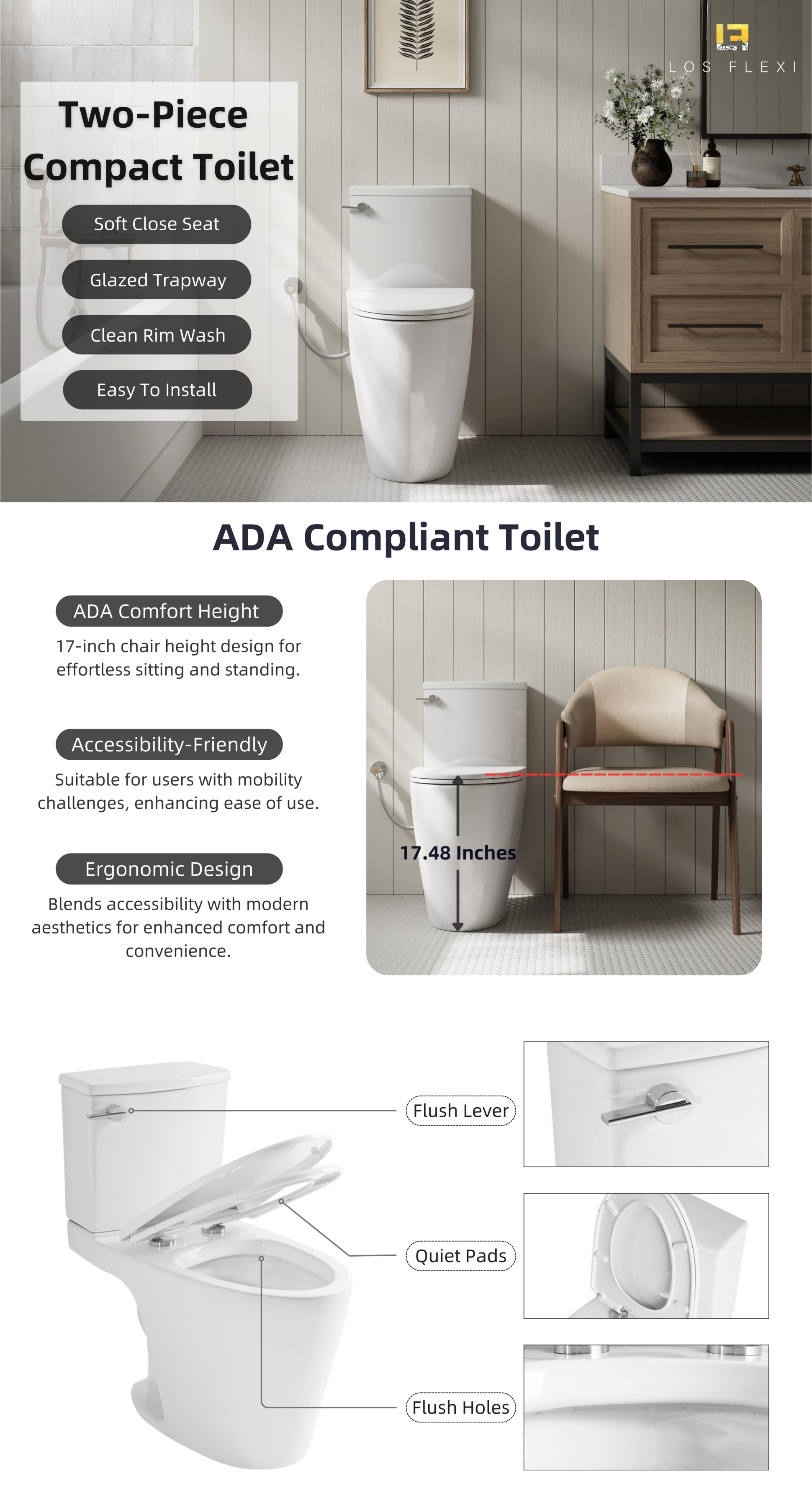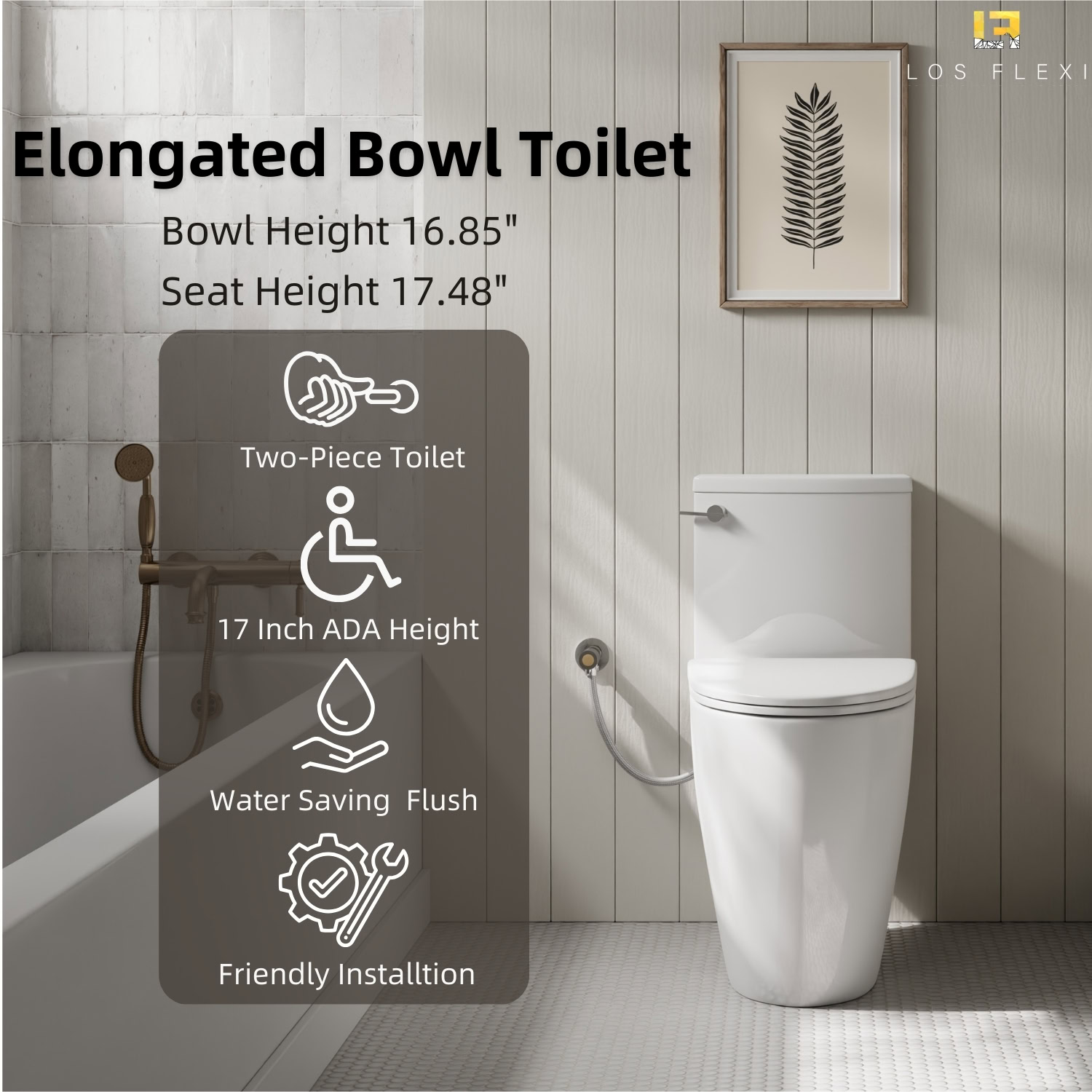 Enjoy comfort with the Los Flexi 17″ ADA-height elongated toilet. It features durable glazed ceramic, a powerful 360° flush, soft-close seat, and a 2-year warranty.