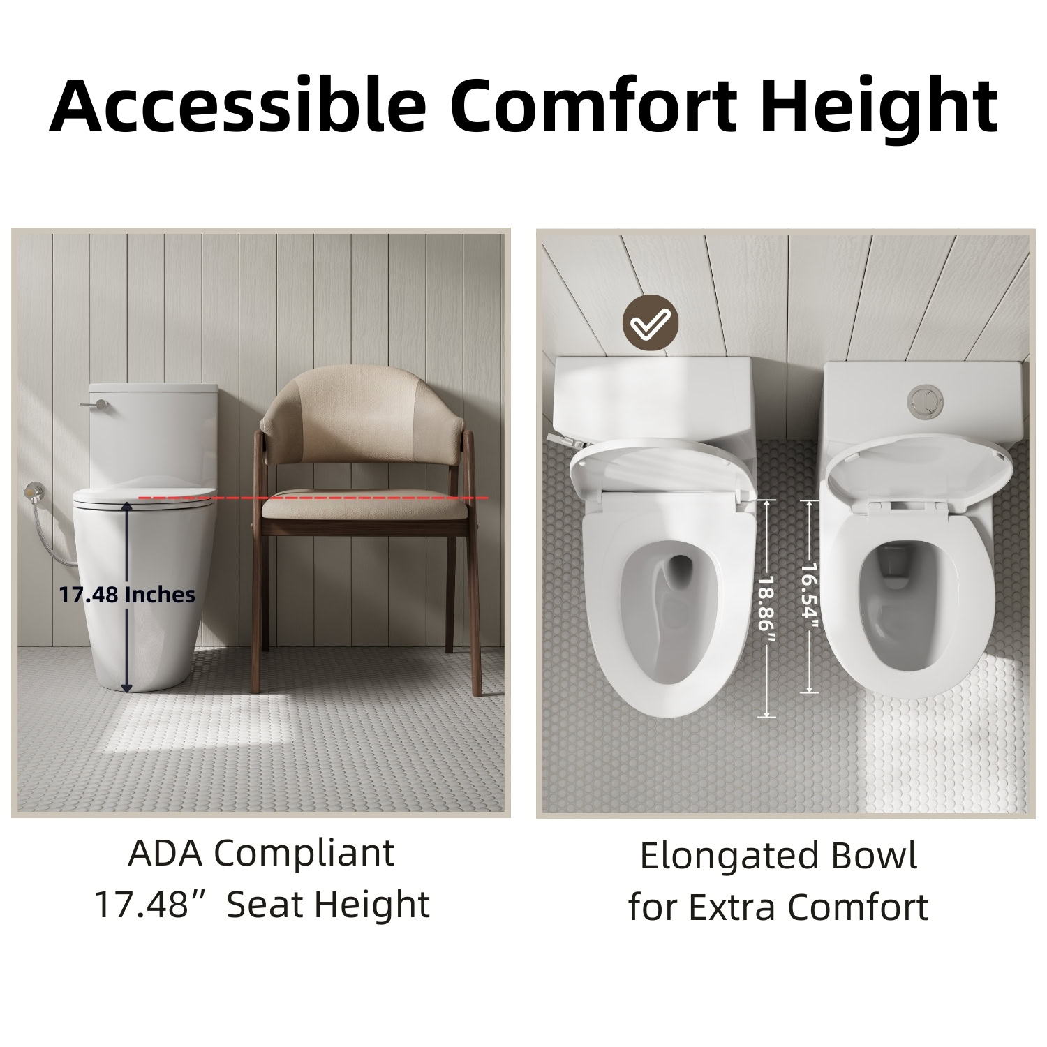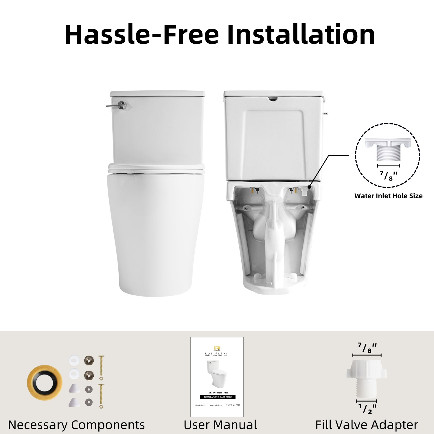 Los Flexi two-piece toilet features a 17-inch chair height, aligning with ADA comfort guidelines to provide a more comfortable seating position and ease sitting and standing for everyday use. Crafted from durable white ceramic, the elongated toilet boasts a smooth, high-quality glazed surface that reduces staining and simplifies routine cleaning, keeping your bathroom pristine with minimal effort.