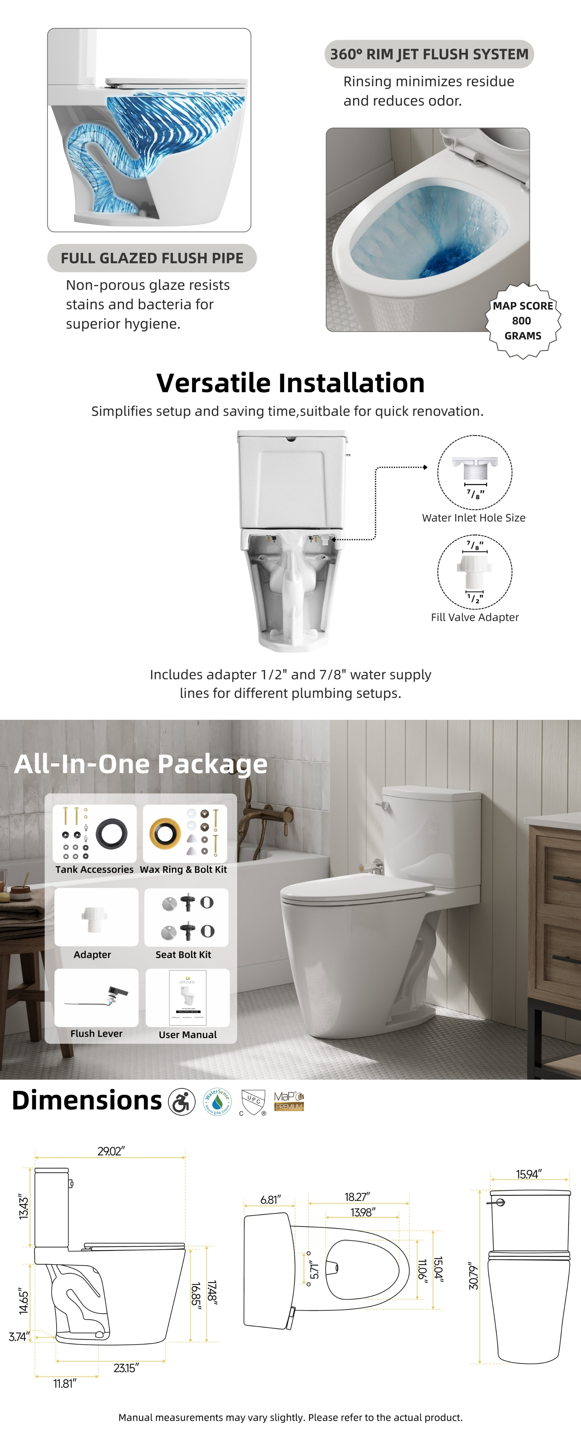 The efficient flush system delivers consistent performance with a powerful 360° rim jet design for thorough bowl cleaning, all managed by a dependable side lever. For ultimate user comfort, the hygienic elongated design includes a noise-reducing soft-close seat and smooth contours for easy maintenance. Installation is straightforward, suitable for a standard 12-inch rough-in, and includes all necessary hardware. Purchase with confidence, as your two-piece toilet is backed by a two-year limited warranty.