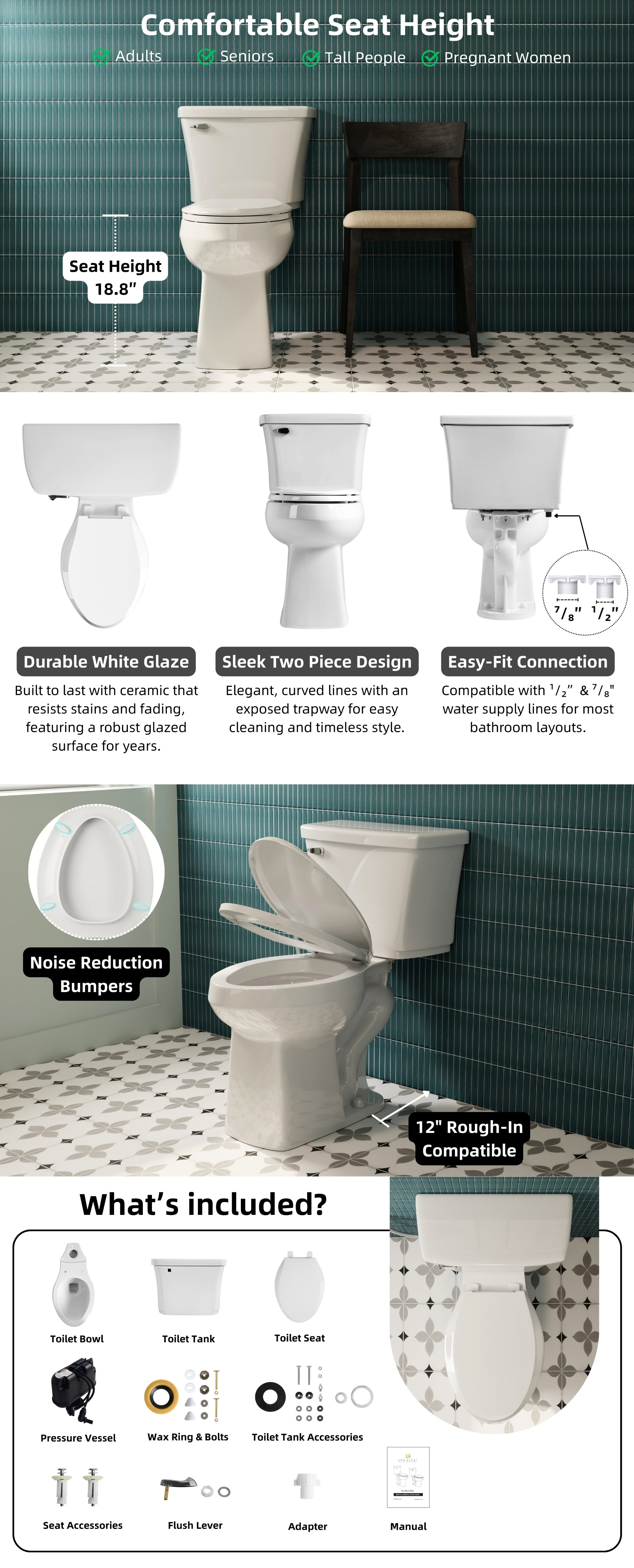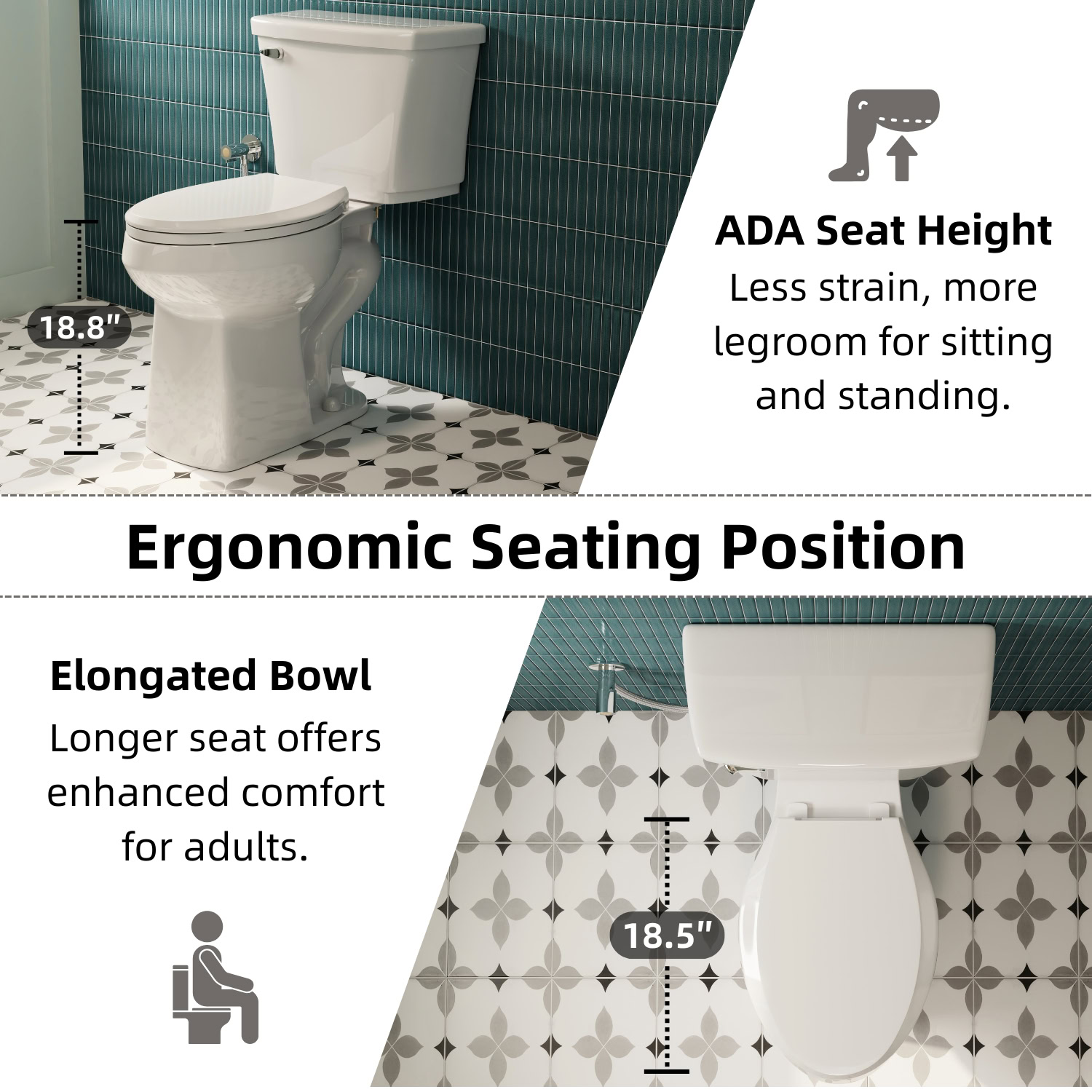 Built for accessible comfort, the toilet features an 18.8″ ADA seat height that offers a more natural sitting and standing position for adults and seniors. The soft-close seat adds a quiet, user-friendly touch, while the standard 12″ rough-in ensures easy compatibility with most bathroom layouts. Installation is straightforward with all included essential hardware, and the elongated bowl provides added comfort without compromising space. Backed by a 2-year limited warranty, this pressure-assisted toilet is a dependable choice for homeowners seeking stronger flushing power, better hygiene, and long-lasting performance.